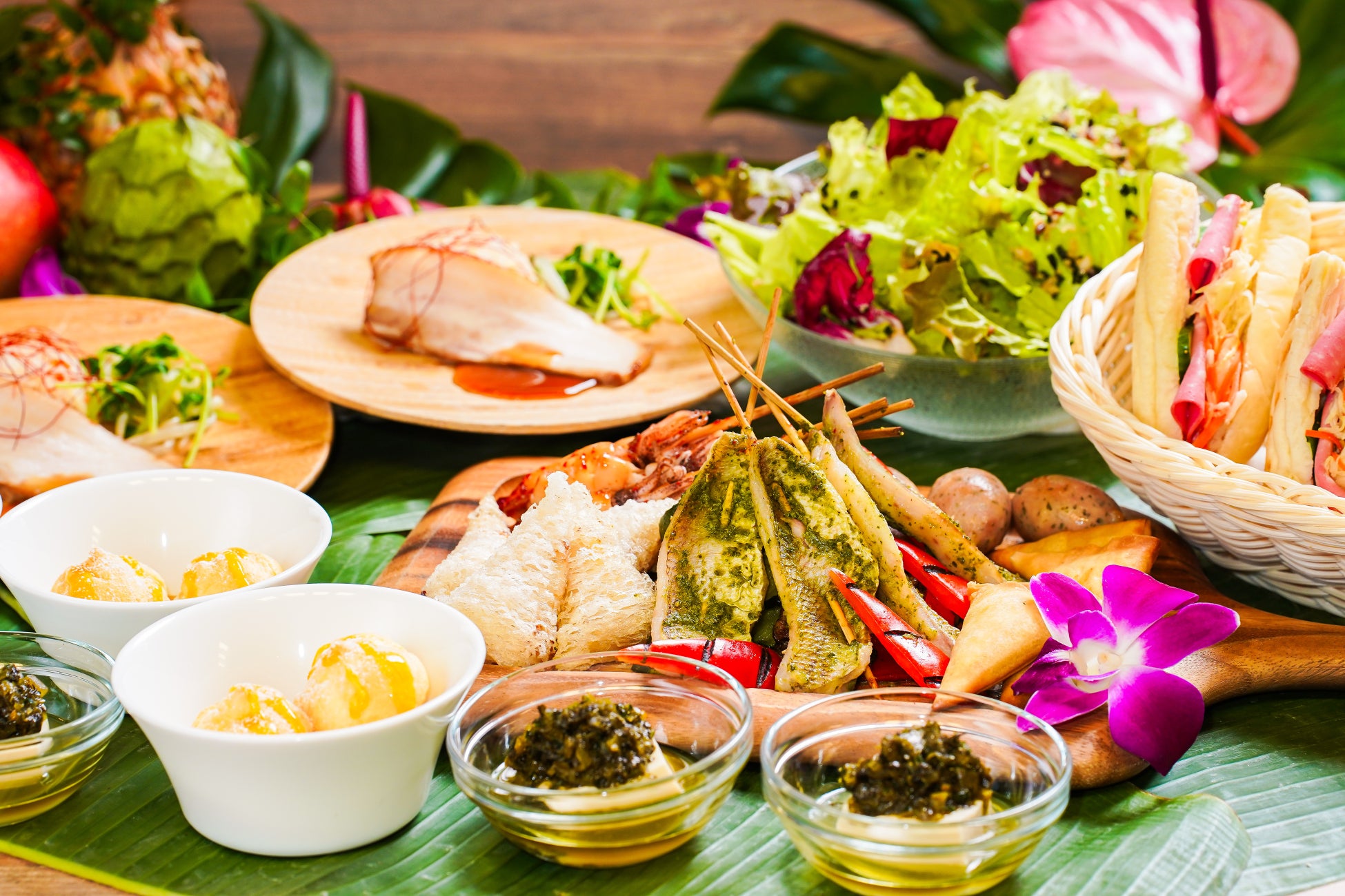 冷奴の高菜ソース/キヌアのヘルシーサラダ/ハーブソーセージ/白身魚とイカのブロシェット/2種のサモサ(ホタテ&カレー)/パニーニ/ルーローハン&茶葉が香るバターライス/プチシューのマンゴーソース がけ