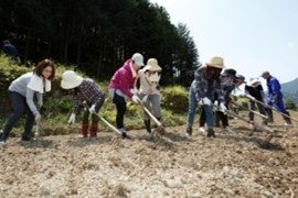 目標の60kgを大きく上回る100kgを収穫。新たに栽培場所を増やし、畑作りから作付け・収穫を行いました。春華堂メンバーとNPO法人こいねみさくぼマンバー約50名が集まり作付けを、そして9月には収穫を行いました。そしてこの年、水窪プロジェクトは、静岡県の取り組みである「一社一村しずおか運動」に認定されました。
