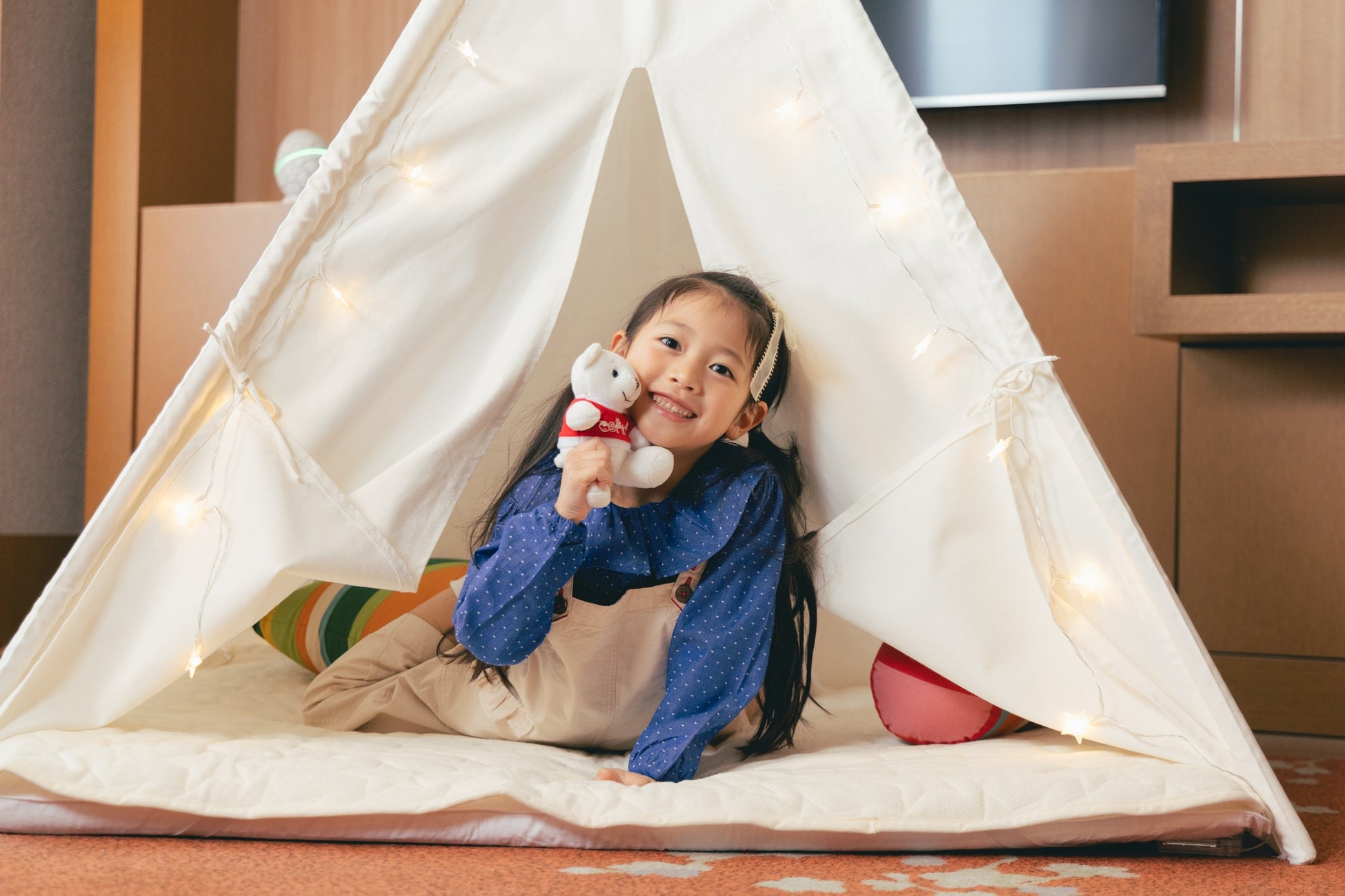 「ドリームファミリー宿泊プラン」では3つのドリームポイントが楽しめます。1つ目のドリームポイントは、広々とした90㎡のスイートルームでの宿泊。お部屋には、ウォークインクローゼットやダイニングテーブル、ゆったりとしたソファースペース、ビジネスデスク、エスプレッソマシーンなどが備わっております。リビングスペースには、お子様が秘密基地のように遊べるキッズテントを設置いたします。このプランでは、エグゼクティブラウンジで特別に通常より1時間早い14時にアーリーチックインが可能。混雑をさけ、ゆったりとお手続きでき、アフタヌーンティーや軽食、ドリンクなどラグジュアリーなひとときを楽しめます。チェックイン時に家族写真をラウンジスタッフが撮影し、後日ご自宅にお送りする特典もございます。