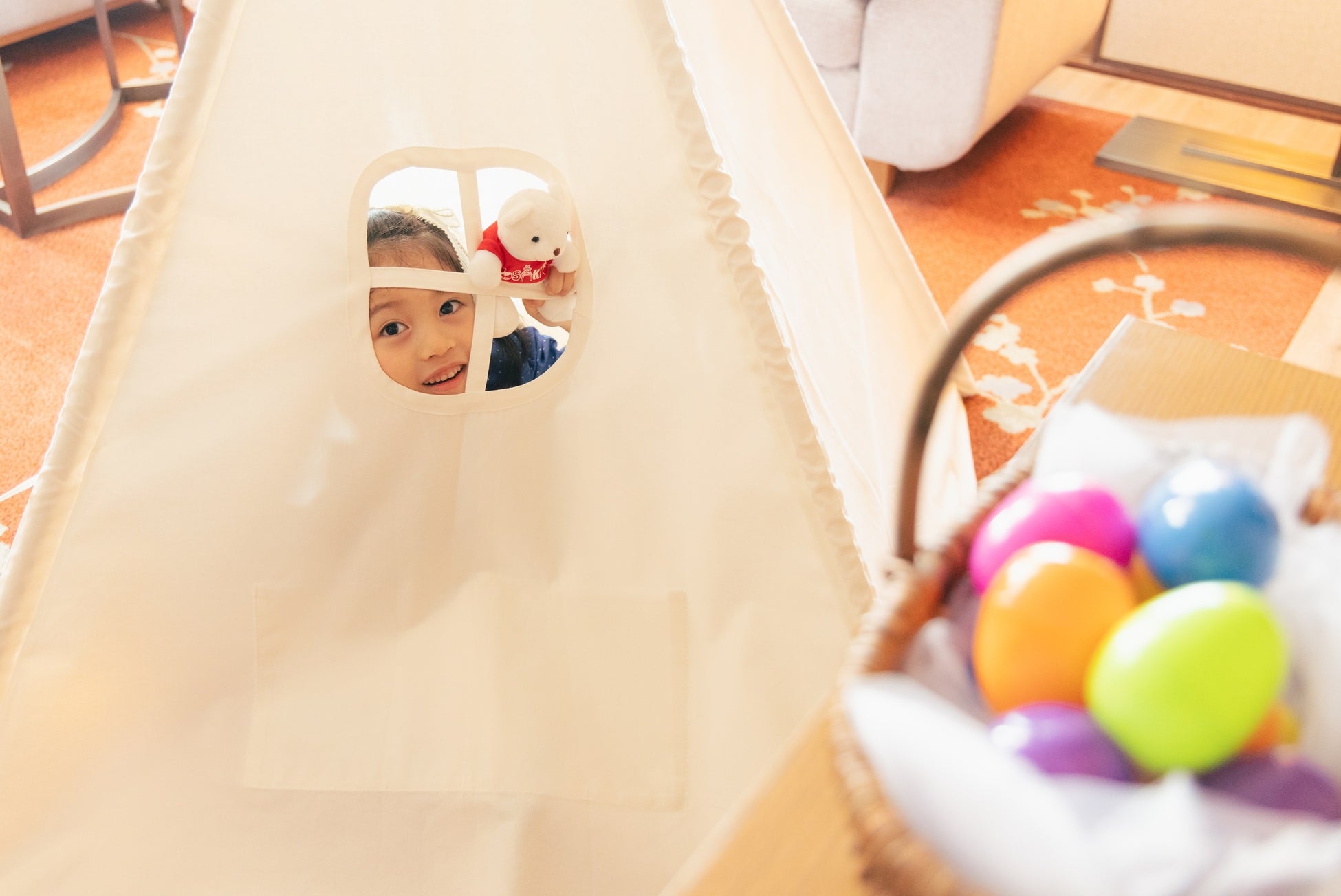 2つ目のドリームポイントは、ご家族で遊べるアクティビティ。おもちゃ入りの「エッグハントセット」をご用意しておりますので、広いスイートルームを活用して、クッションの下や、枕の下などに、親子で隠したり、探したり。おもちゃの卵はお持ち帰りいただけます。また、チェックイン時にお渡しする「キッズ・パスポート」で館内スタンプラリーにもご参加いただけ、コンプリートするとホテルオリジナルグッズをプレゼントします。そのほかにも、無料の水着レンタルもございますので、フィットネスセンターの室内プールご利用もおすすめです。