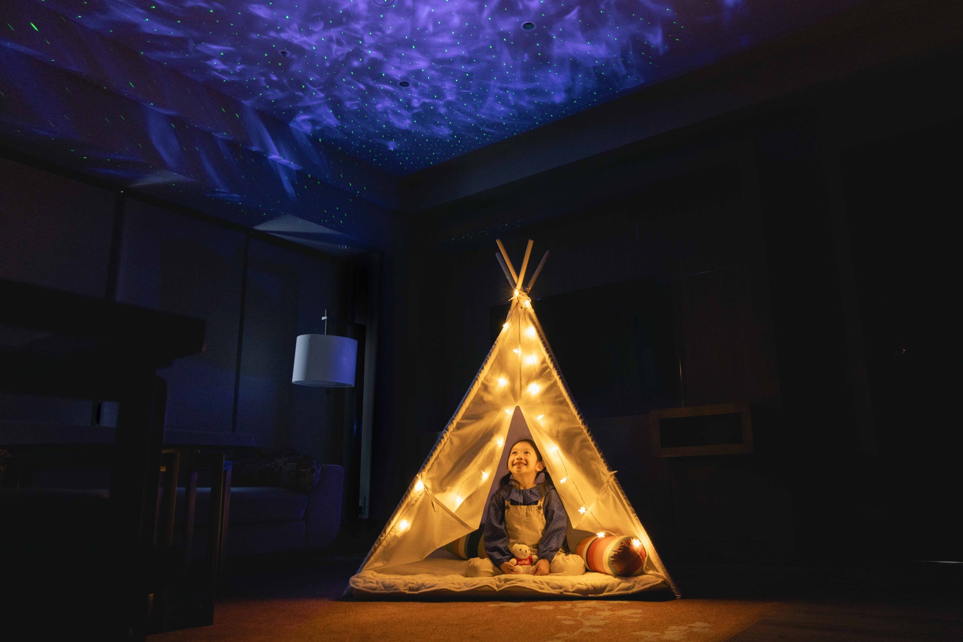 3つ目のドリームポイントは、都会で楽しむ煌めく夜空。スタープロジェクターを使い天候に左右されず、いつでもお部屋で幻想的な星空気分をご満喫ください。窓の外には都会的な夜景が煌めき、お部屋の中では映し出された夜空でアウトドア気分を味わえます。今までにない魅力的なホテルステイをご家族でお楽しみください。