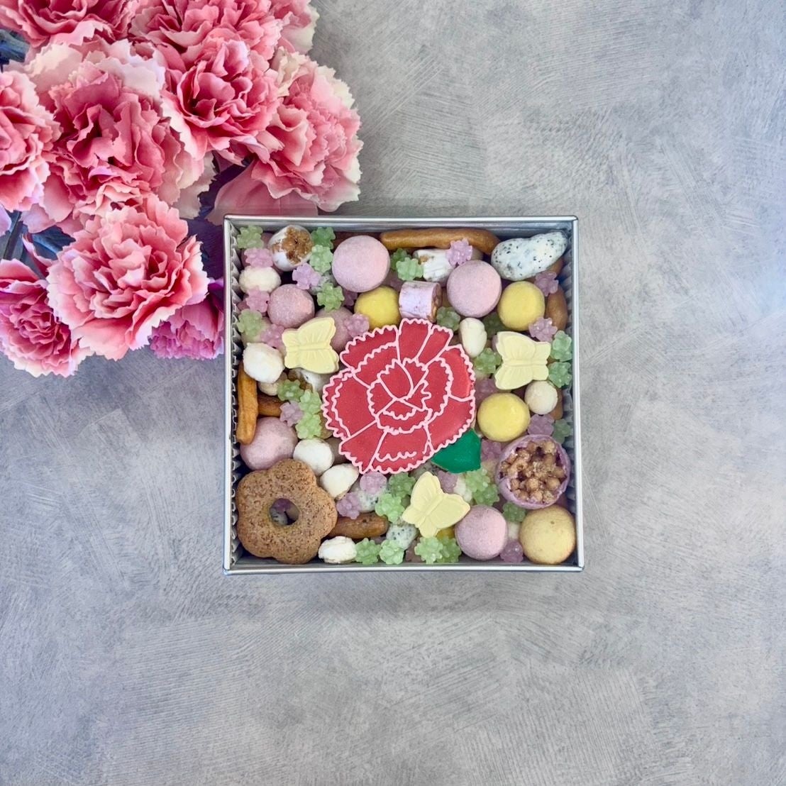 蓋を開けた時、大輪で鮮やかなカーネーションのアイシングクッキーに目を奪われ、思わず笑顔がこぼれてしまいそうな、母の日限定の華やかなふきよせです。