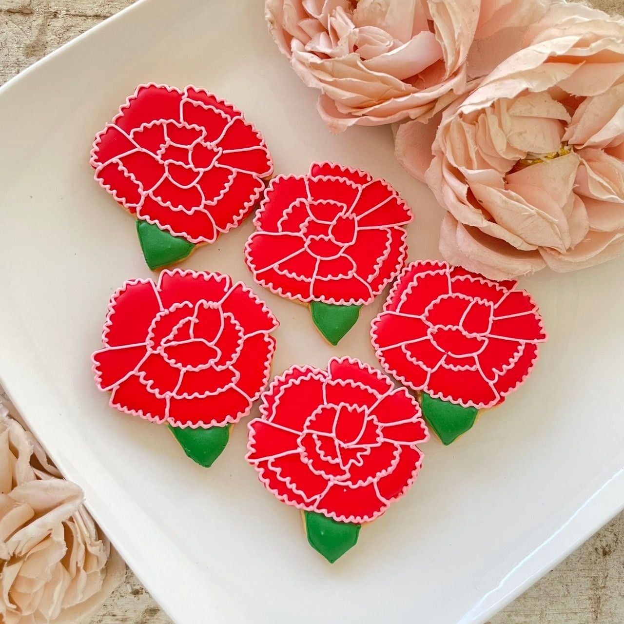 可憐に咲くカーネーションのアイシングクッキーのまわりには、可愛らしい和三盆の蝶々が集まってきています。