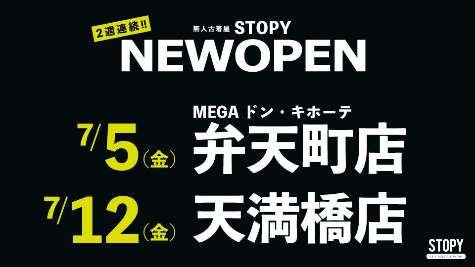 株式会社JAM TRADINGが運営する無人古着屋「STOPY(ストッピー)」が2024年7月5日(金)に大阪市港区 弁天町へ、更に翌週の7月12日(金)には大阪市中央区 天満橋へ新店舗をオープンする。