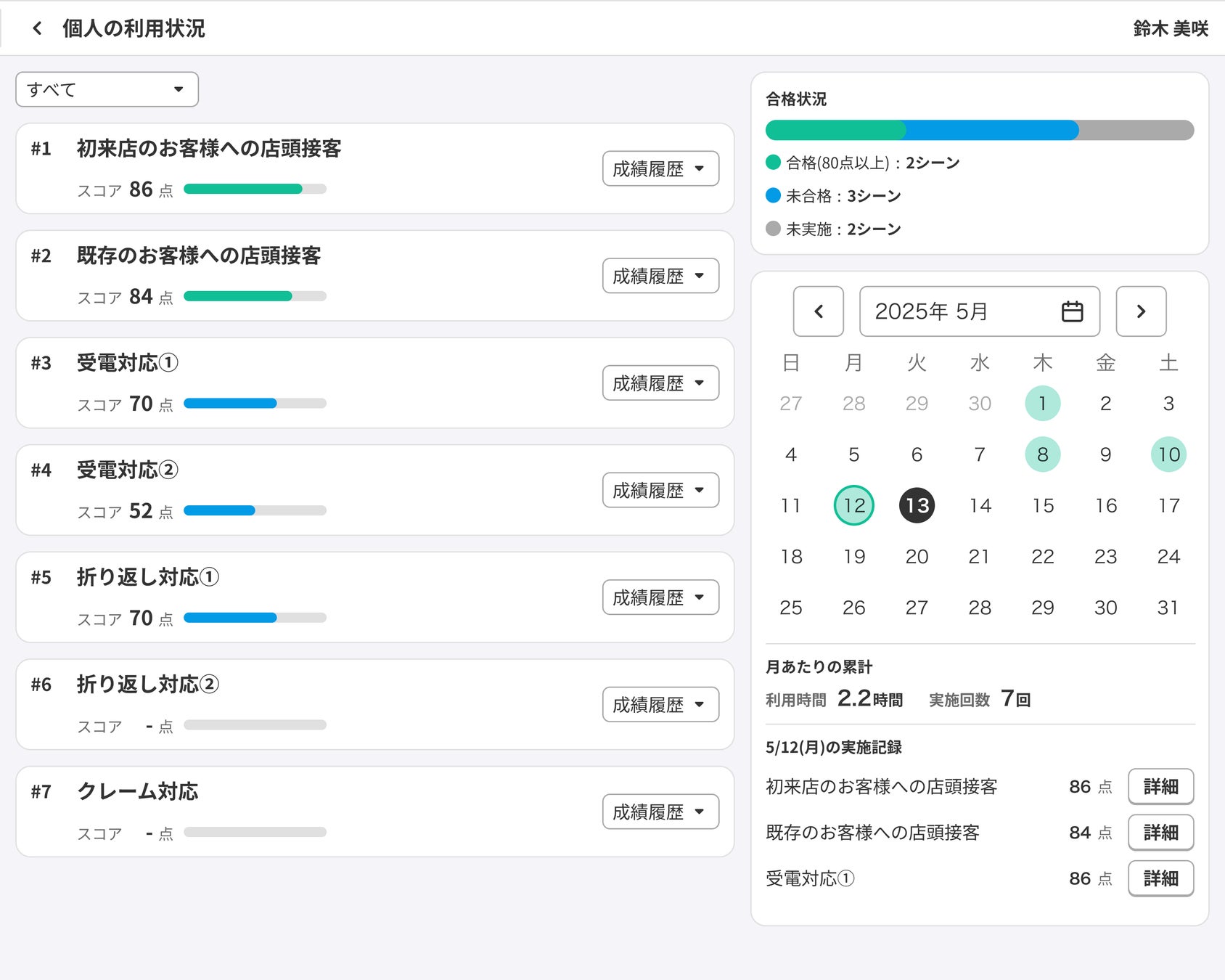 よく使用されているシナリオやスコアが高い・低い場面を可視化することで、現場で重点的に使われている対応パターンやトレーニング内容が整理されます。こうしたデータは、研修内容の見直しや、顧客満足・売上向上との関連性を捉える際にも活用でき、人材育成が経営にどう貢献しているかを具体的に示す材料となります。