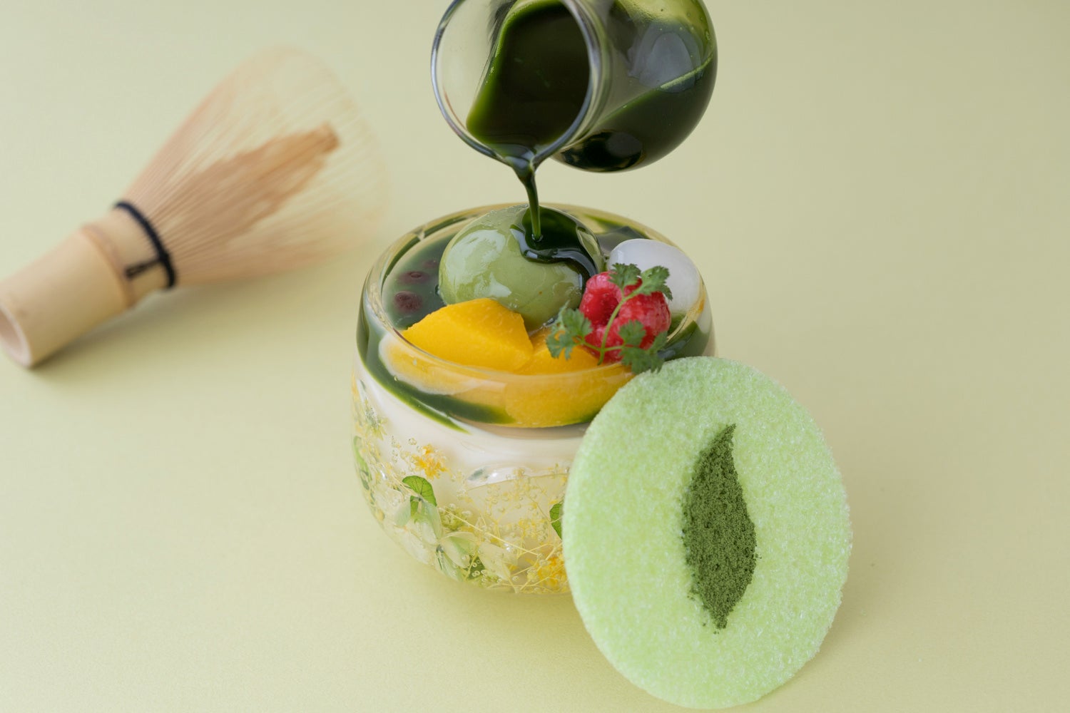 オリジナルで制作したハーバリウムパフェグラスに、濃厚なミルクプリン、寒天、黄桃、白玉、赤エンドウ豆、特製抹茶アイスクリームをトッピング。FUKUCHA自慢の抹茶蜜をお好みでかけてお召し上がりいただきます。