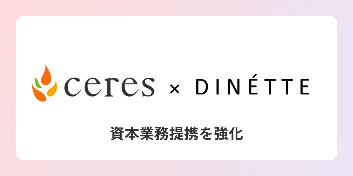 DINETTE株式会社(本社:東京都渋谷区、代表取締役:尾﨑美紀、以下、当社)は、株式会社セレス(本社:東京都渋谷区、代表取締役社長:都木聡、以下、セレス社)を引受先として、第三者割当増資による資金調達を実施し、資本業務提携を強化することをお知らせいたします。