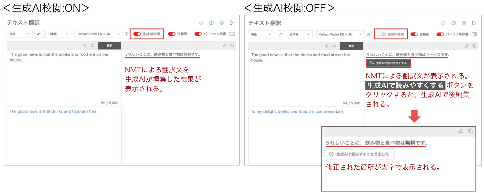 「生成AI校閲」がOFFの場合、ユーザーはNMTによる翻訳結果を確認した上で、必要に応じて「生成AIで読みやすくする」ボタンの操作により生成AIによる後編集を実行できます。