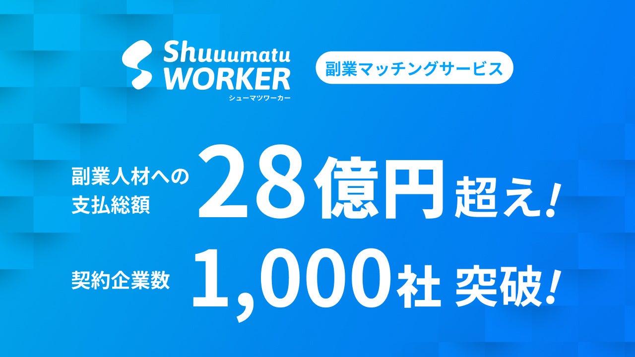 株式会社シューマツワーカー(本社:東京都渋谷区、代表取締役CEO:松村 幸弥)は、提供する副業マッチングサービス「シューマツワーカー」における副業人材への支払総額(*1)が28億円を超えたことを発表いたします。また、契約企業数は1,000社を突破(*2)し、今後もますます多くの企業・個人に、「働き方」の選択肢を広げる副業人材マッチングとオンボーディング支援サービスを提供してまいります。