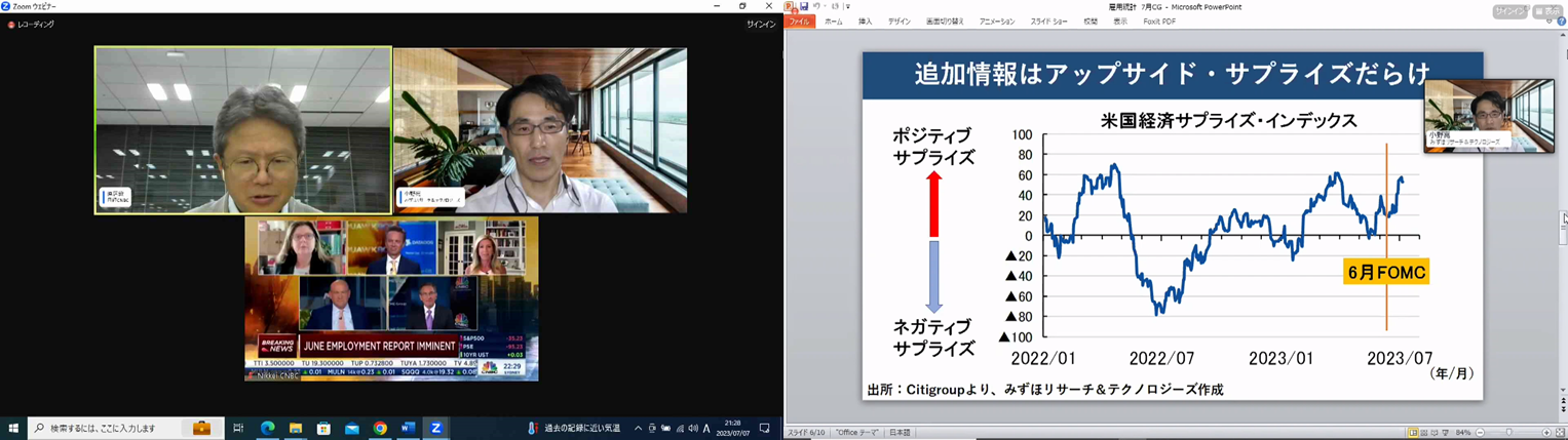 21:30からの米CNBCによる雇用統計の結果速報を控え、21:20から小野亮氏が見どころを説明。その後、速報を視聴しながら、発表結果から今後のマーケットへの影響とポイントを解説したほか、次回FOMCの展望を語りました。