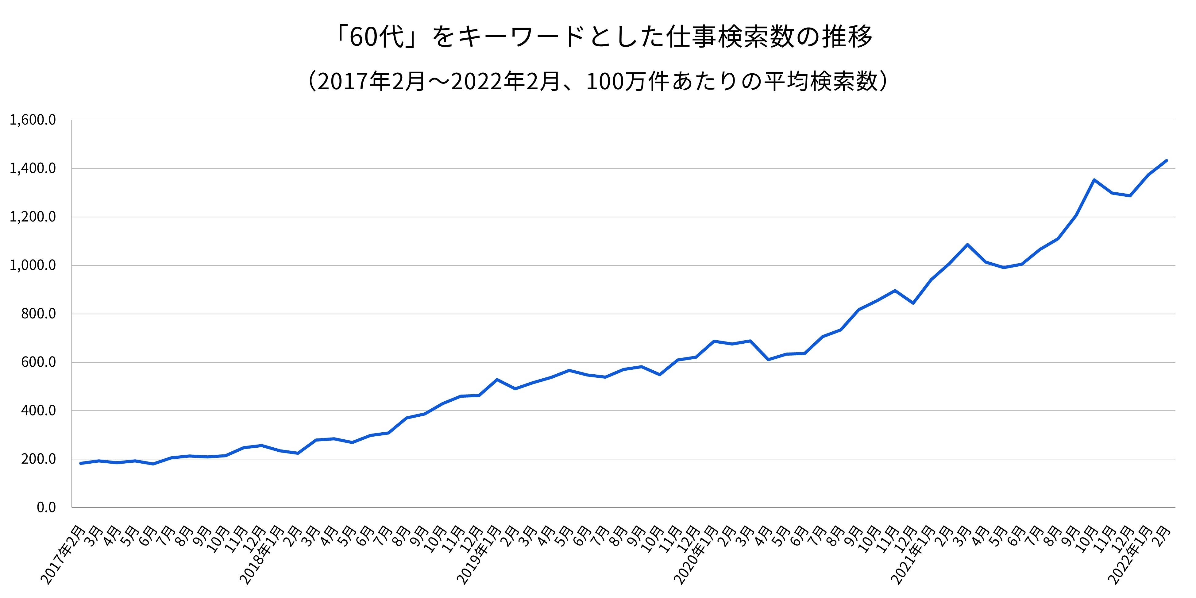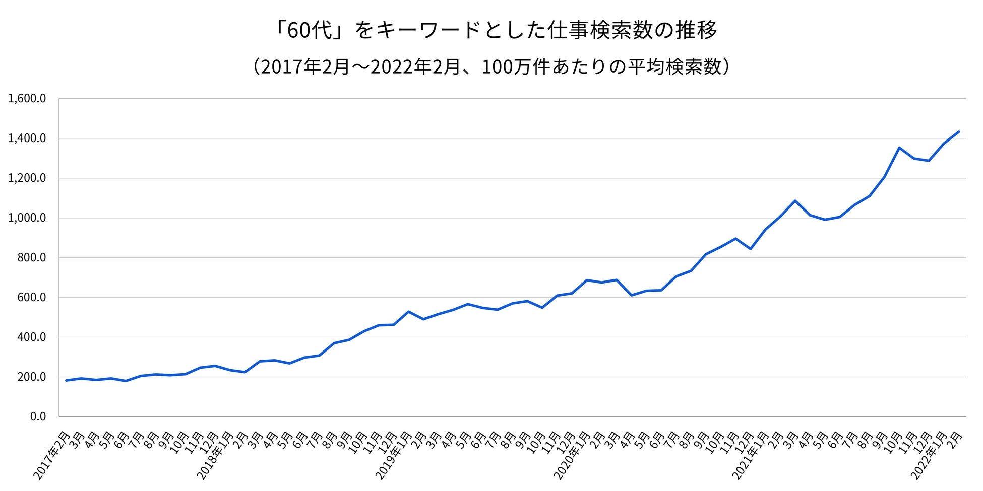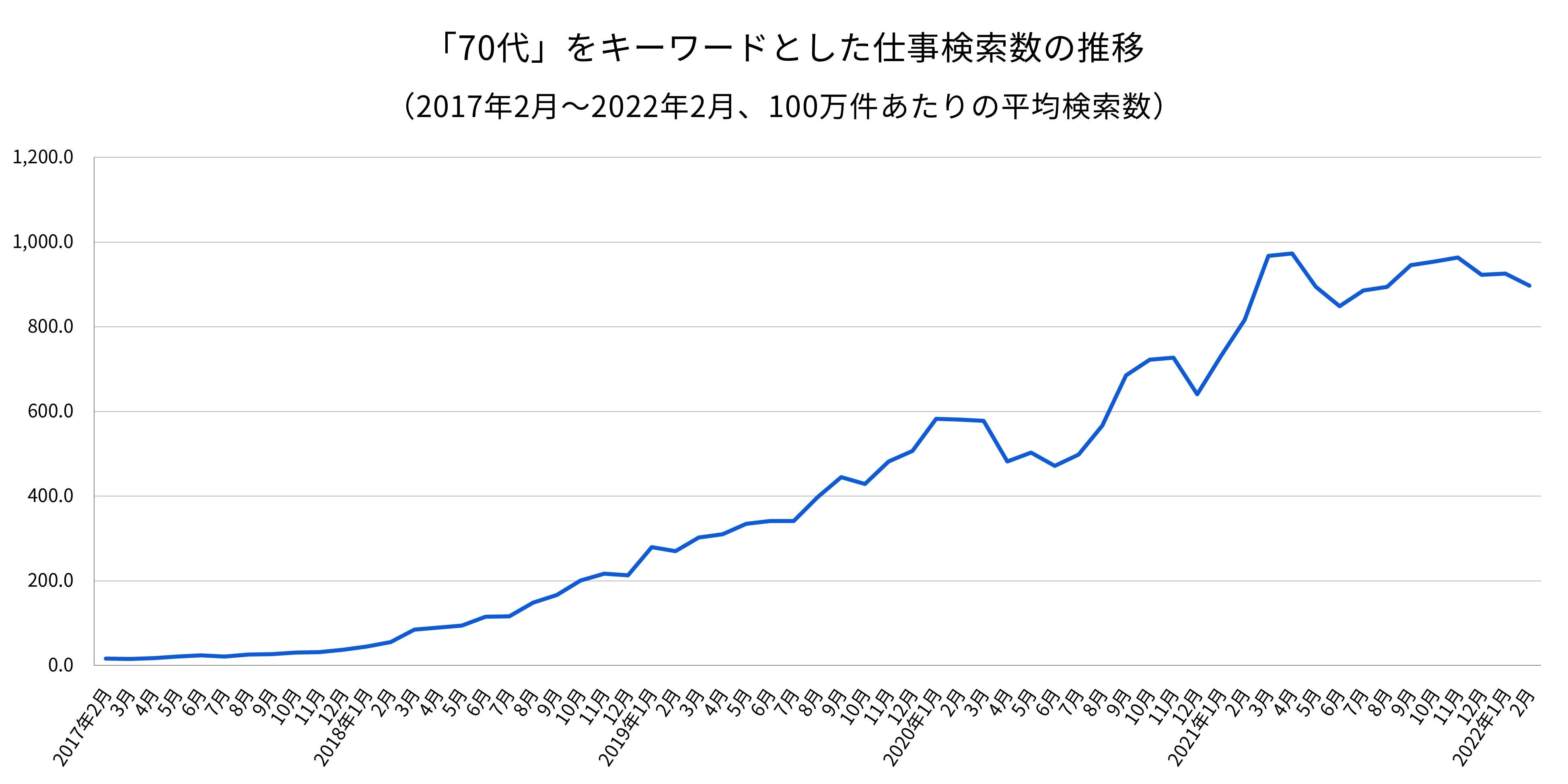 2021年4月1日に施行された改正高齢者雇用安定法により、65歳から70歳までの労働者の就業機会を確保するために、事業主に対し「70歳までの定年引上げ」「70歳までの継続雇用制度」などの措置を講ずる努力義務が新設されました。また、2022年4月より、年金制度改正法等の施行により年金制度の一部が改正され、繰下げ受給の上限年齢が引上げられました。これらの環境変化に伴い、働く高年齢層が増えていくと考えられます。そこで、高年齢層の仕事探しがどのような状況にあるか、2017年2月から2022年2月の過去5年間を対象に、Indeed上での仕事検索状況を調査しました。