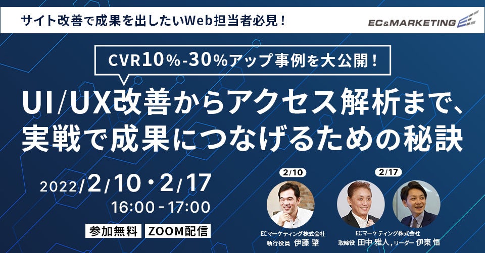 Webマーケティング支援サービスを展開しているECマーケティング株式会社((本社:東京都港区 代表取締役社長:中山高志)は、Web担当者様向けに「UI/UX改善×Googleアナリティクス」をテーマにしたウェビナーを2月10日・17日に開催いたします。