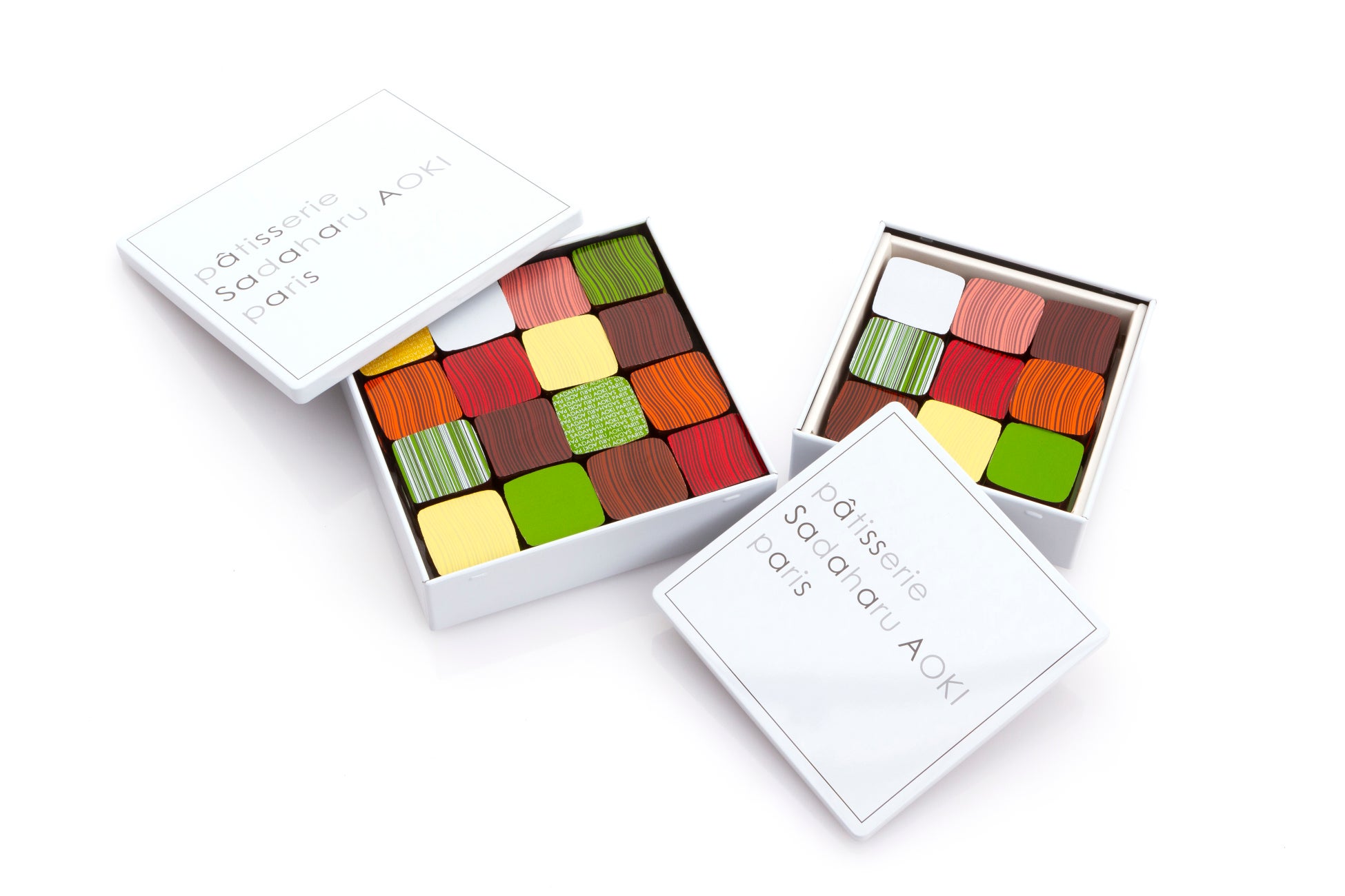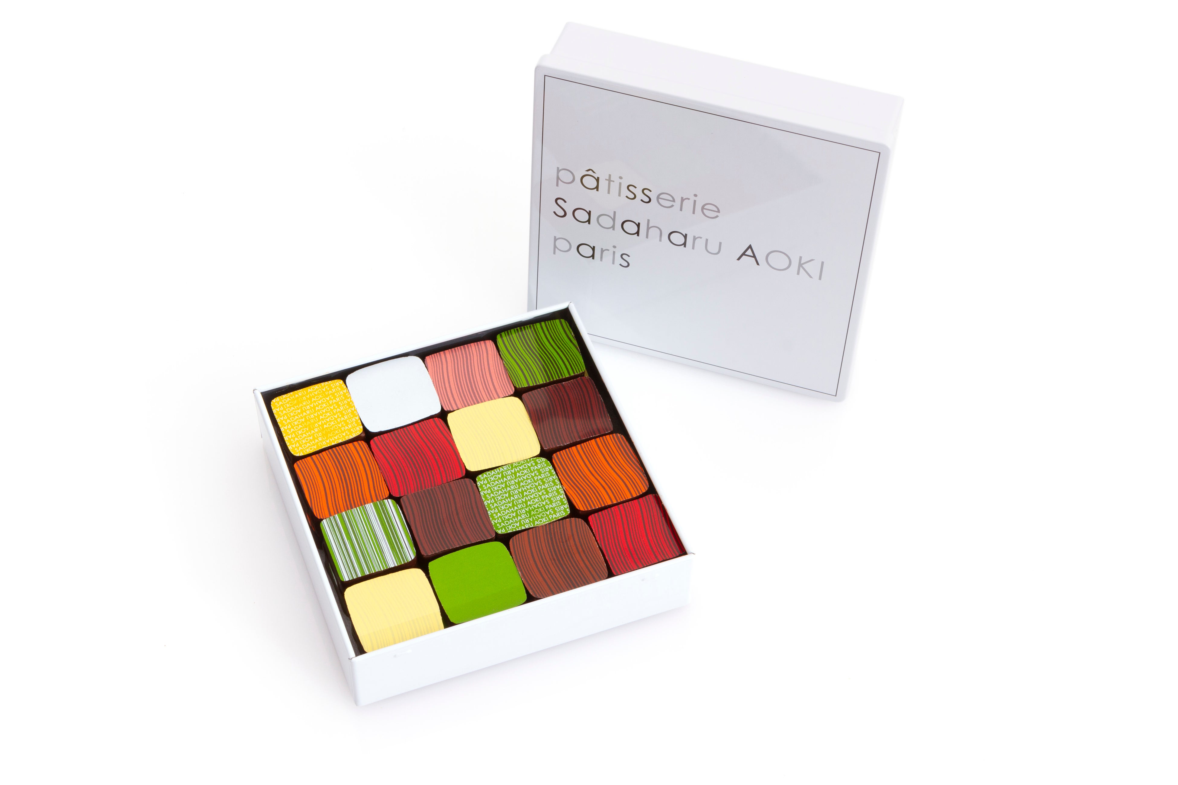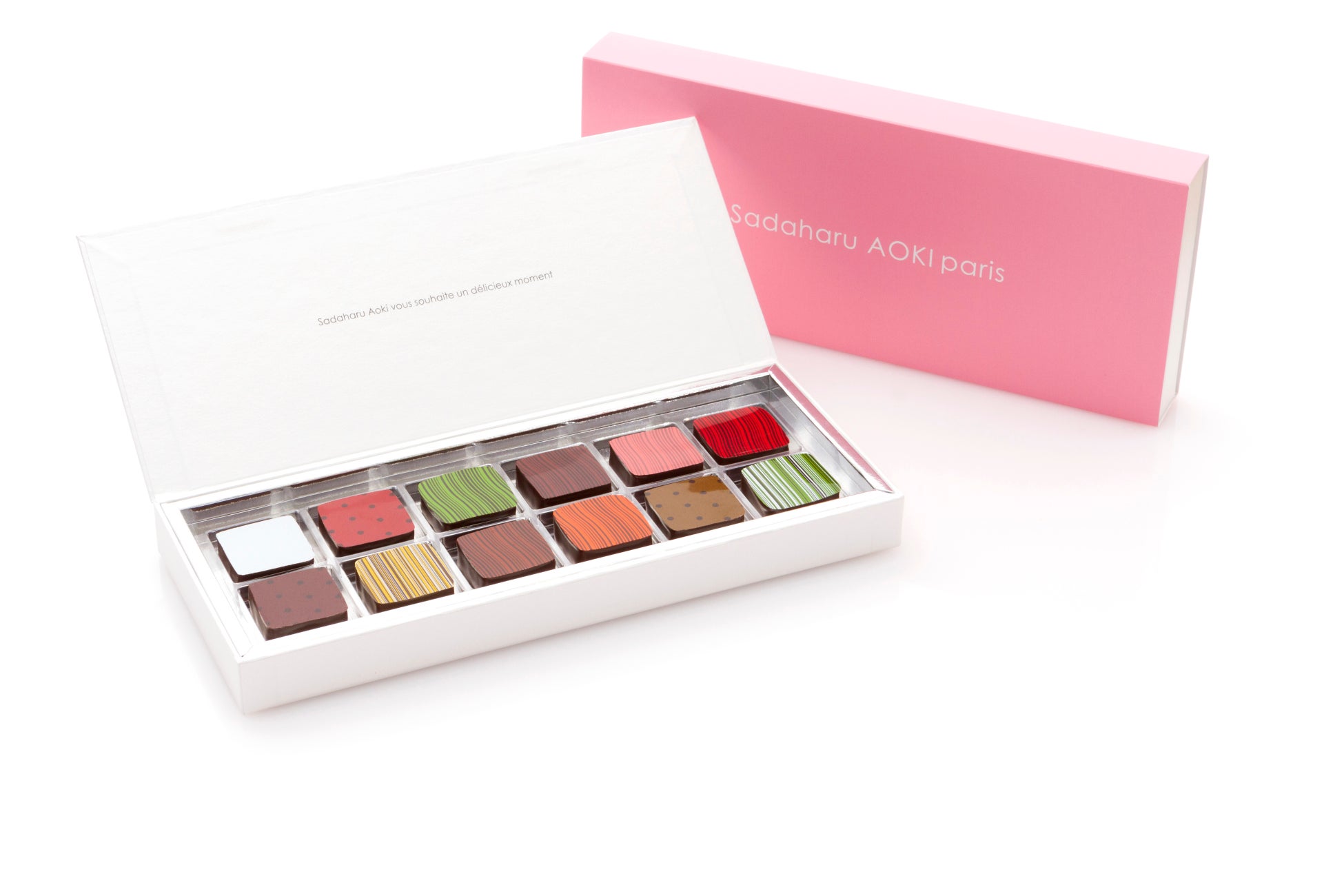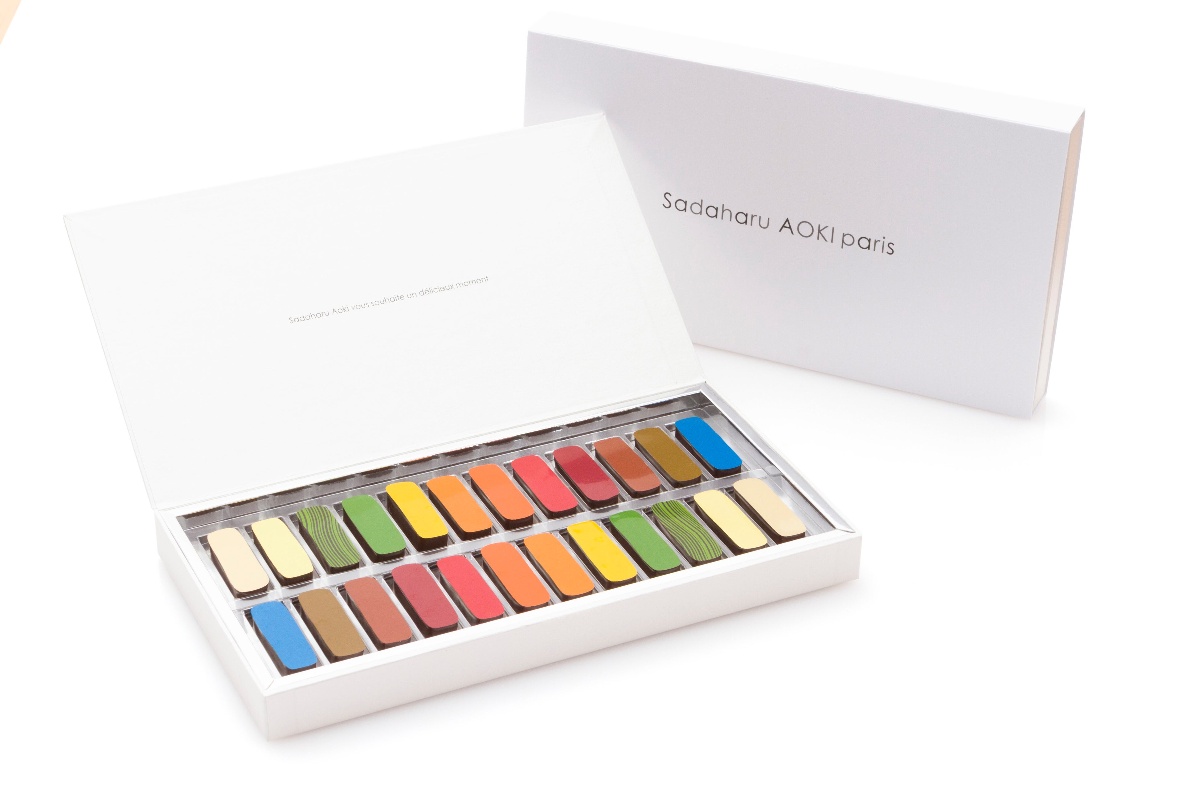 蓋を開けると化粧パレットをイメージしたカラフルなショコラがずらりと並ぶ、サダハルアオキの代表的ショコラ。圧巻の美しさを放つ24個入りのボックスがホワイトデー限定で登場します。