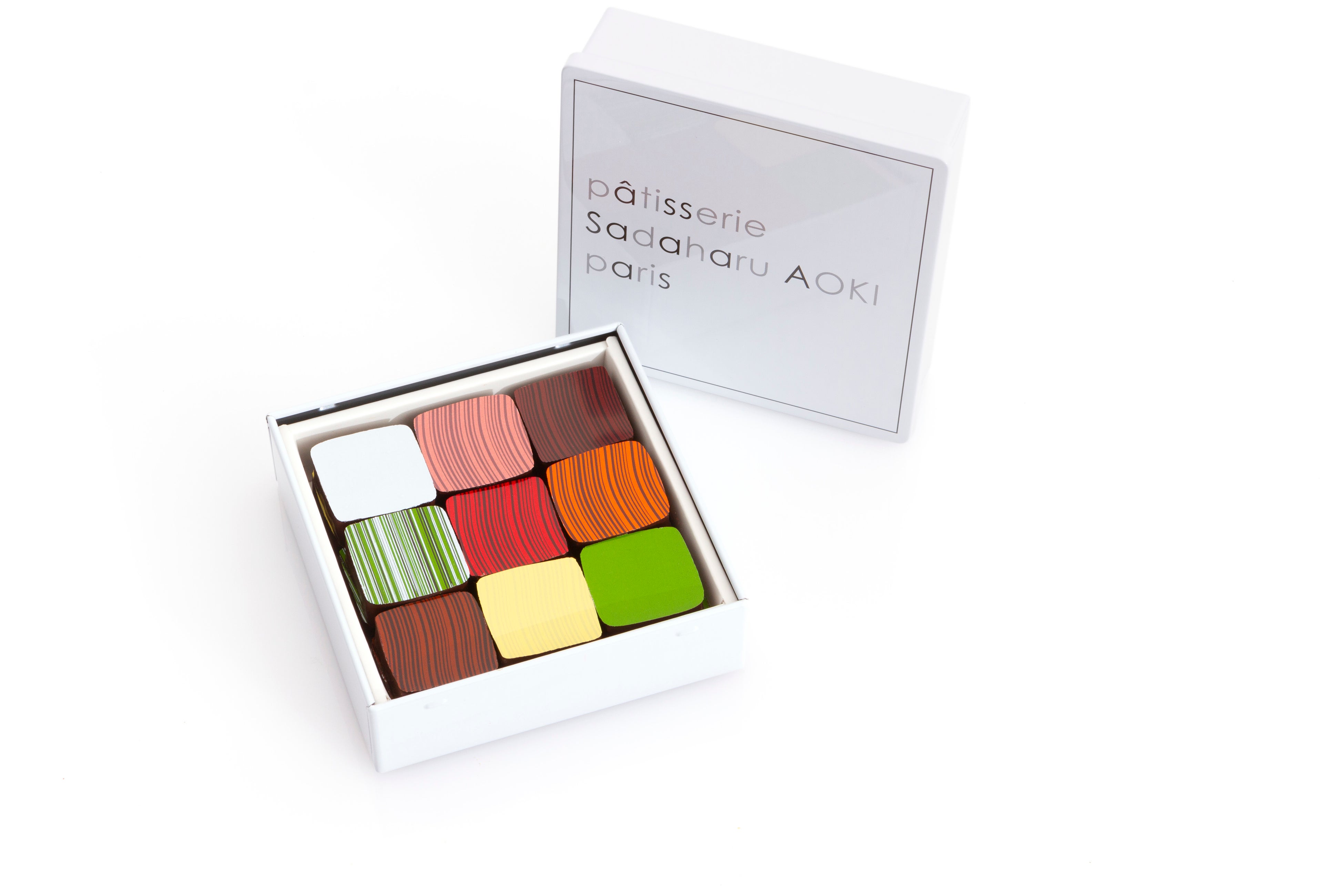 “カレ(=正方形)”のボンボンショコラの詰め合わせ。定番フレーバーに加え、このボックスでしか味わえないガナッシュもアソートした魅力あふれるボックス。アオキのロゴをあしらった缶に詰め合わせた直営店限定のボックスです。