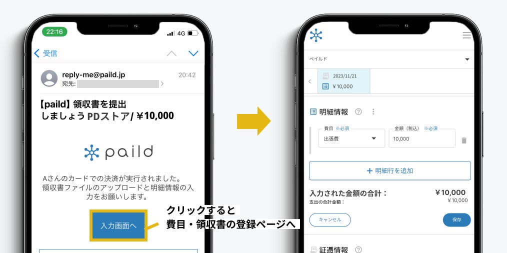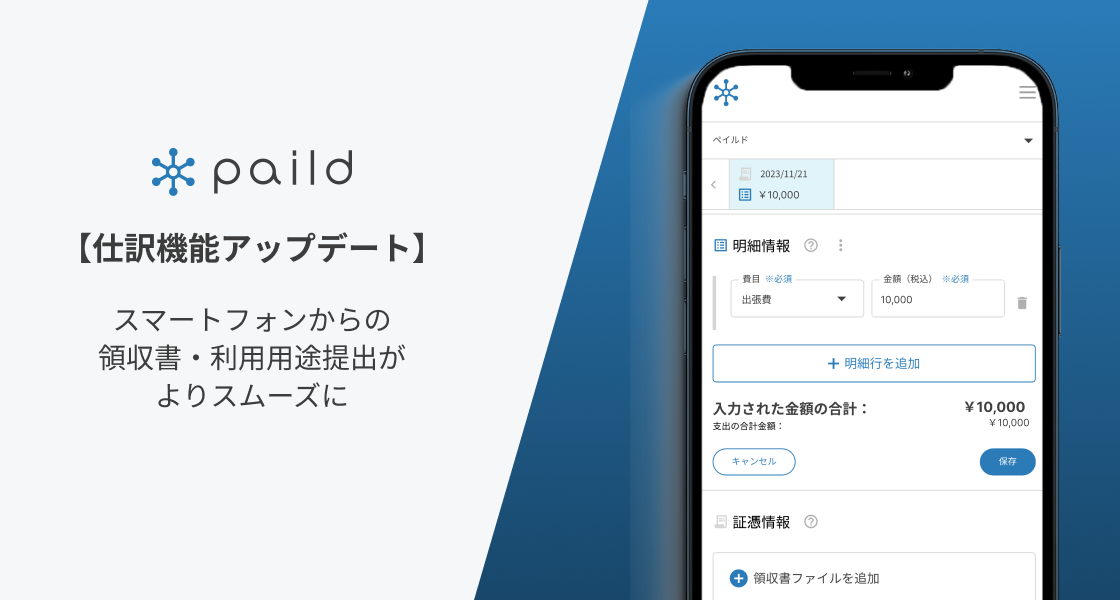 クラウド型法人カード「paild」、仕訳機能をアップデート。カード決済後に届くメールから、領収書と利用用途をまとめて登録可能に