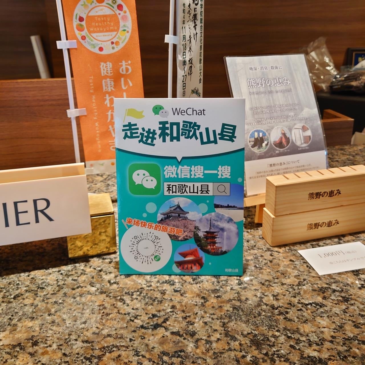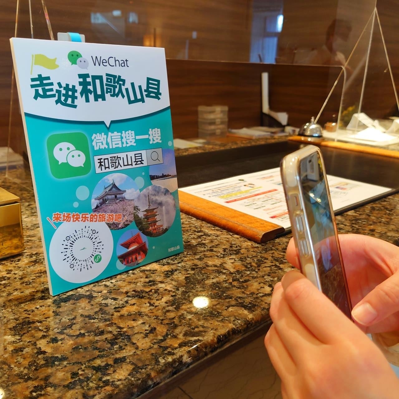 また、和歌山県ではホテルの受付などにWeChatのQRコードを添付した案内POPを設置しています。受付の待ち時間にQRコードをスキャンし、部屋でゆっくりと観光情報をご覧いただけます。