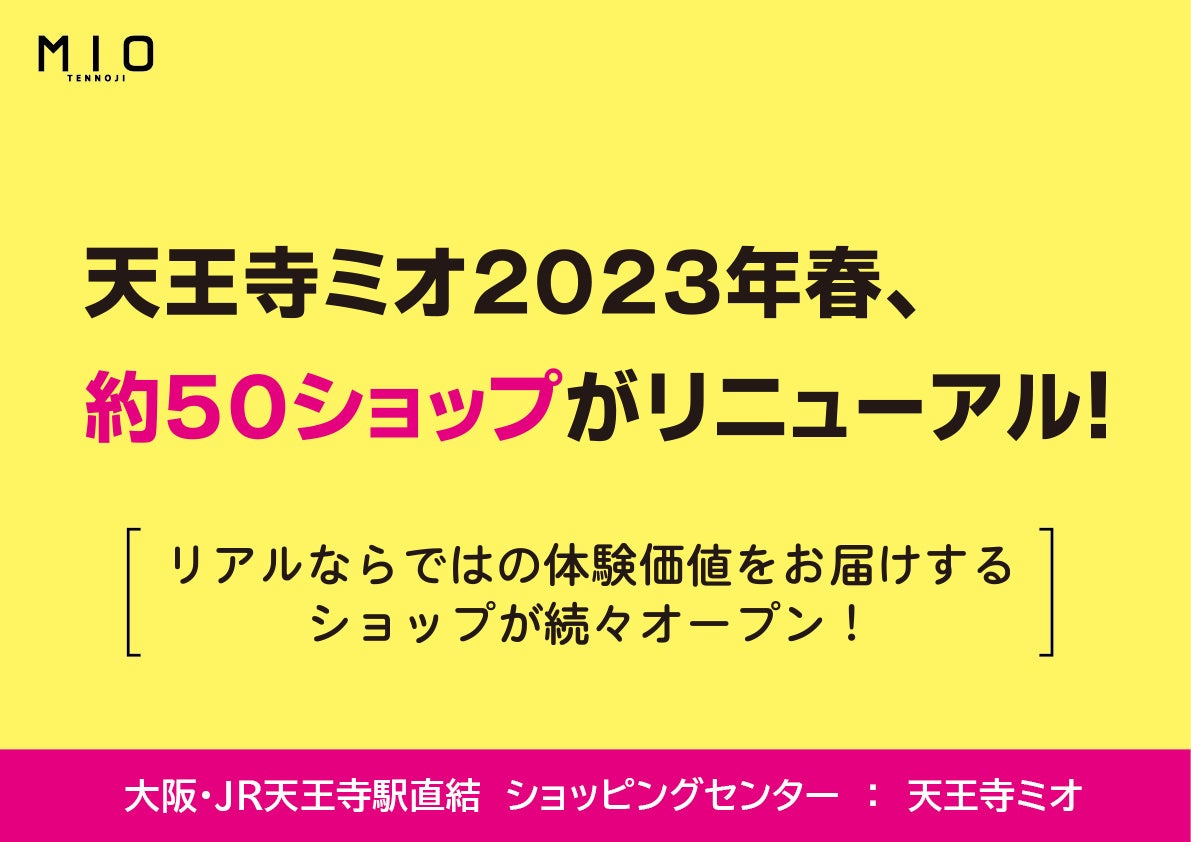 JR西日本SC開発株式会社(本社:大阪府大阪市)が運営する天王寺・阿倍野エリア最大級の「ファッション」と「食」を中心としたJR天王寺駅直結の商業施設:天王寺ミオは、春のリニューアルとして2月から4月にかけて新規30ショップ、改装18ショップの合計約50ショップが順次オープンします。