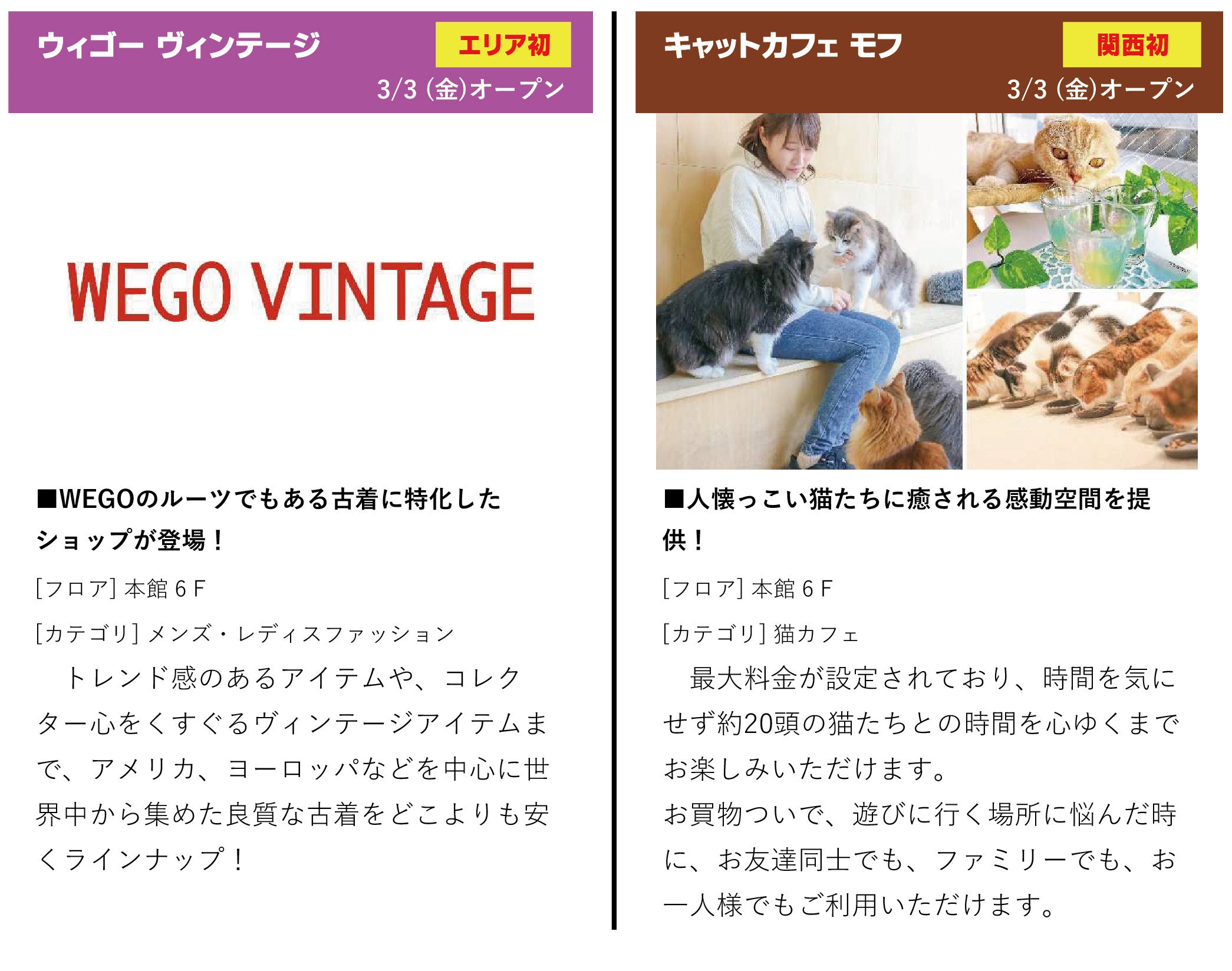 本リニューアルの目玉となる本館6階については、フロアの半分以上にあたる12店舗がリニューアルします。大阪市内2店舗目となる「#ワークマン女子/ワークマンシューズ」に加え、人気キャラクターショップや直接ネコと触れ合えるカフェや、SNSで誰かに自慢したくなるような映えメニューを提供するフード店等を導入します。また、フロア中央のイベントスペース「スパイラルスクエア」には50名以上が利用可能なイートインスペースも新設。お気に入りが見つかる、大切な人と過ごしたくなる、ワクワクするフロアに生まれ変わります。
