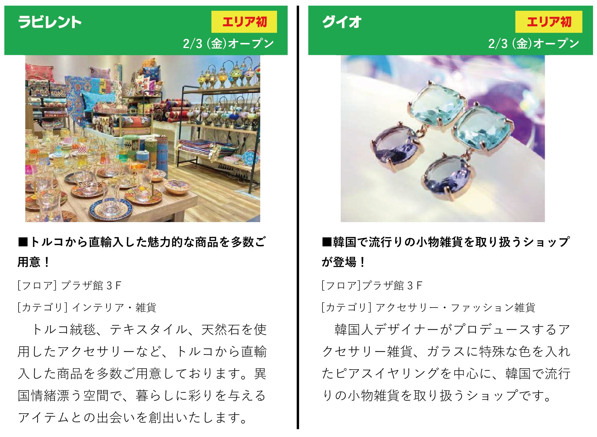 他にも、「サロン アダム エ ロペ」「カスタネ」といった人気のファッションブランドや、「酒場 てっぽう」「江戸前回転鮨 紀州弥一」といった食材にこだわった地域の名店や人気店が新たに加わります。また、ミオでお馴染みのライフスタイル雑貨店もパワーアップ。「セリア」、「スリーコインズプラス」の売り場拡大、「プラザ」の改装などミオでのお買物が益々便利になります。