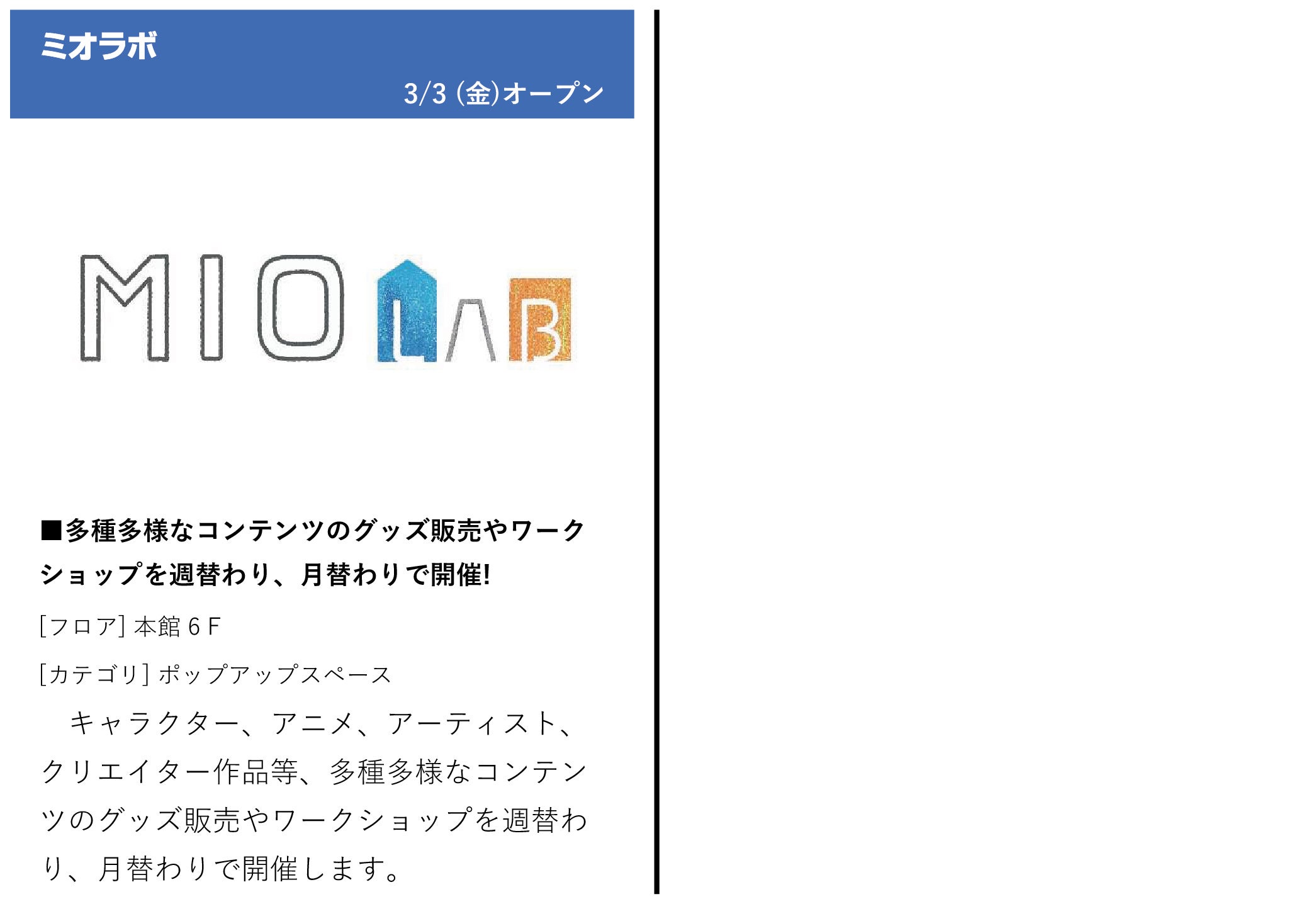 本リニューアルでは、コロナ禍を経て変化している“多様性” “嗜好性”、オンラインでは味わえないリアルならではの“体験価値” “人との繋がり”に焦点を当て、もともとの強みである「ファッションのMIO」に加えて、来街者がつい立ち寄りたくなるような新しい要素も取り入れます。