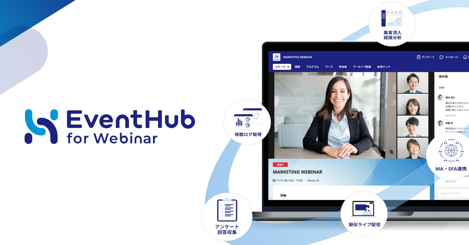 株式会社EventHub (東京都港区、代表取締役CEO:山本 理恵) が提供するシェアNo.1(※)イベント・ウェビナーマーケティングプラットフォーム「EventHub(イベントハブ)」は、2月1日より、ウェビナー特化の新サービス「EventHub for Webinar」の提供を開始いたします。