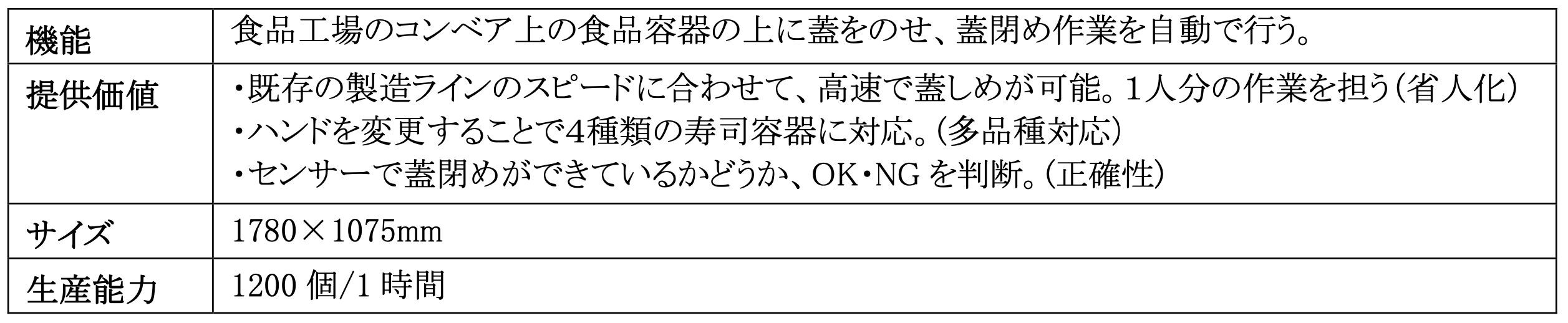 特 徴 :コンベア上の寿司容器に自動で蓋を乗せ、閉めることができるロボットシステムです。コンパクトな設計のため既存ラインに容易に設置することが可能です。食品工場の生産性向上に貢献します。