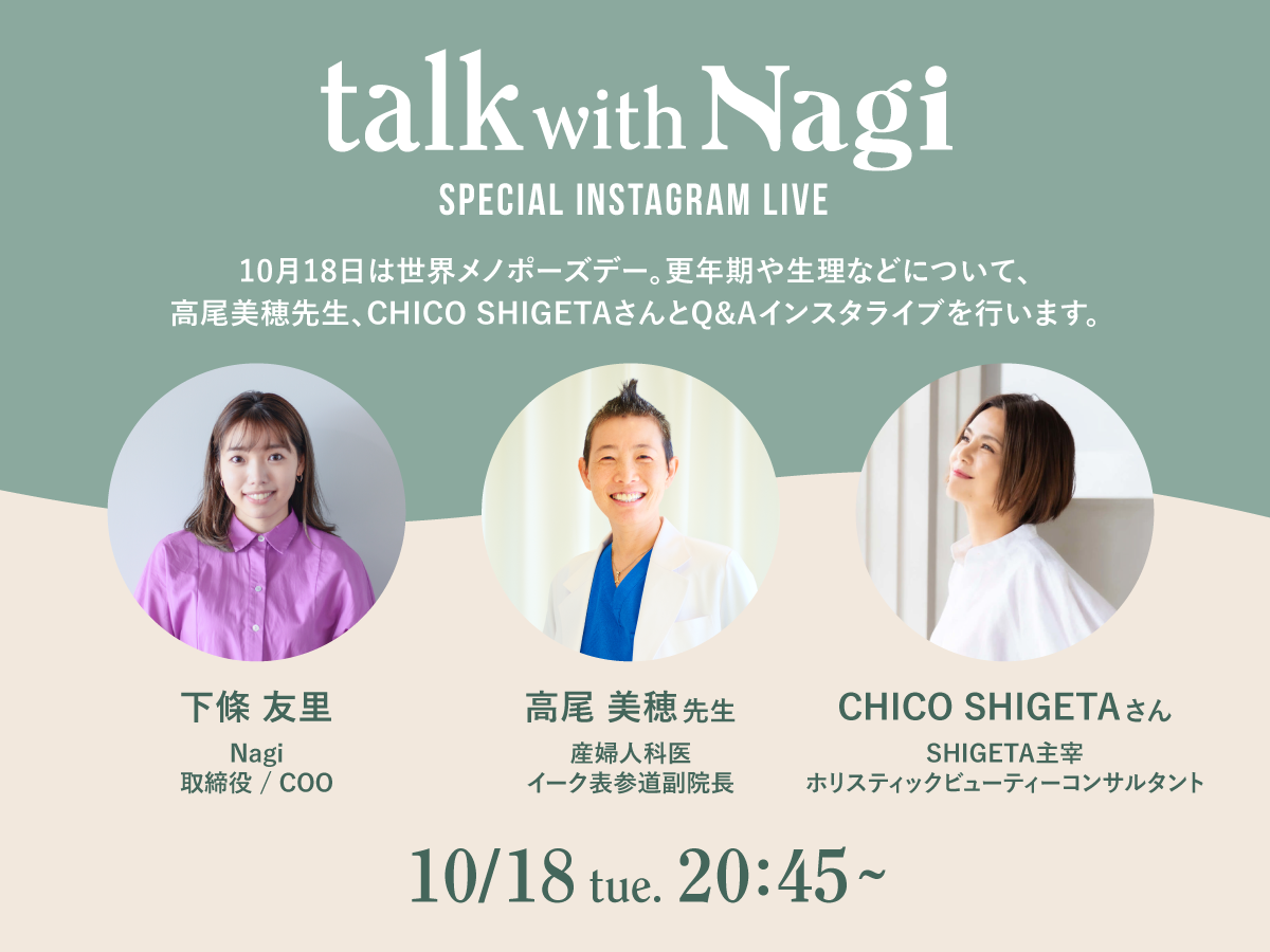 「talk with Nagi - わたしたちの心と身体に自由を -」企画の一環として、10月18日(火)20:45から、「年齢による身体の変化とヘルスケア」をテーマとしたインスタライブを実施します。