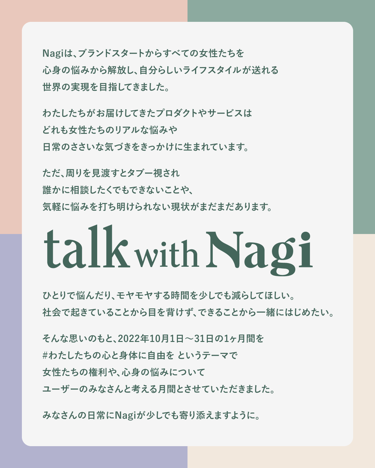 10月の期間中は上記のイベント以外にも、Nagi公式Instagram、Twitterアカウントにて、それぞれのテーマにもとづきながら社会問題や女性たちのヘルスケアについてのコンテンツを発信してまいります。ぜひ「#talkwithNagi」「#わたしたちの心と身体に自由を」であなたの考えも聞かせてくださいね。