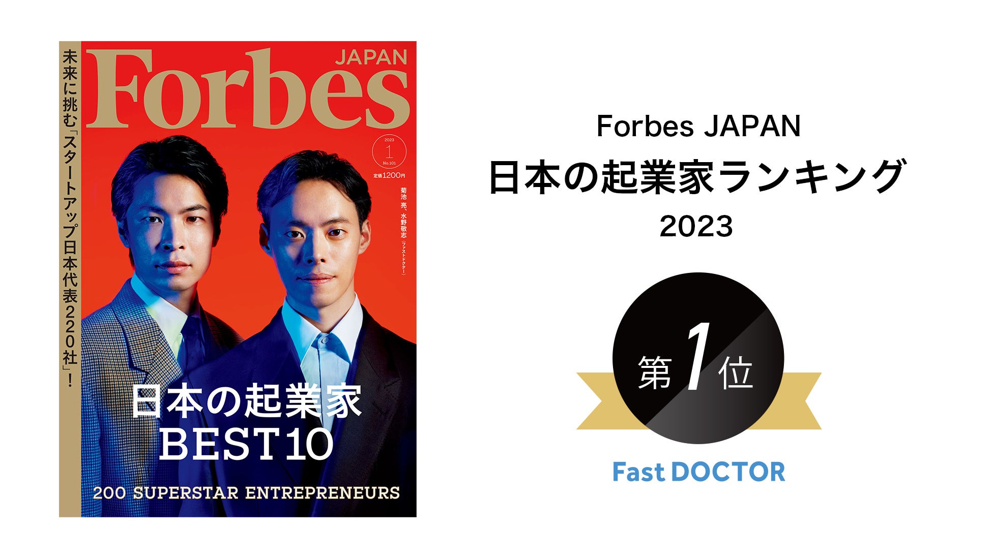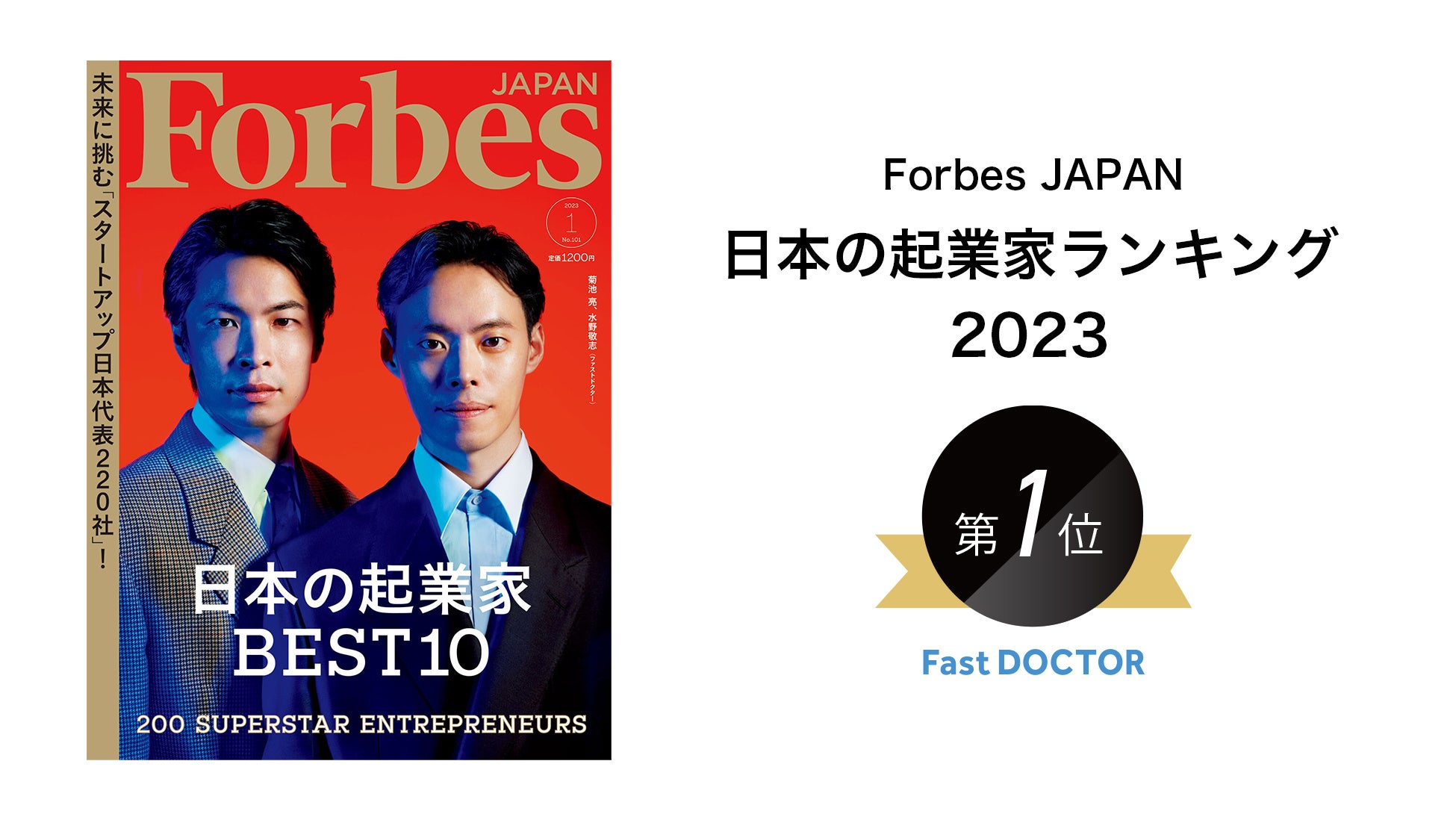 日本最大級の医療プラットフォーム「ファストドクター」を開発・運営するファストドクター株式会社(本社:東京都港区、代表取締役:菊池 亮(医師)、水野 敬志、以下ファストドクター )は、本日発表のForbes JAPAN「日本の起業家ランキング2023」において、1位を受賞したことをお知らせいたします。