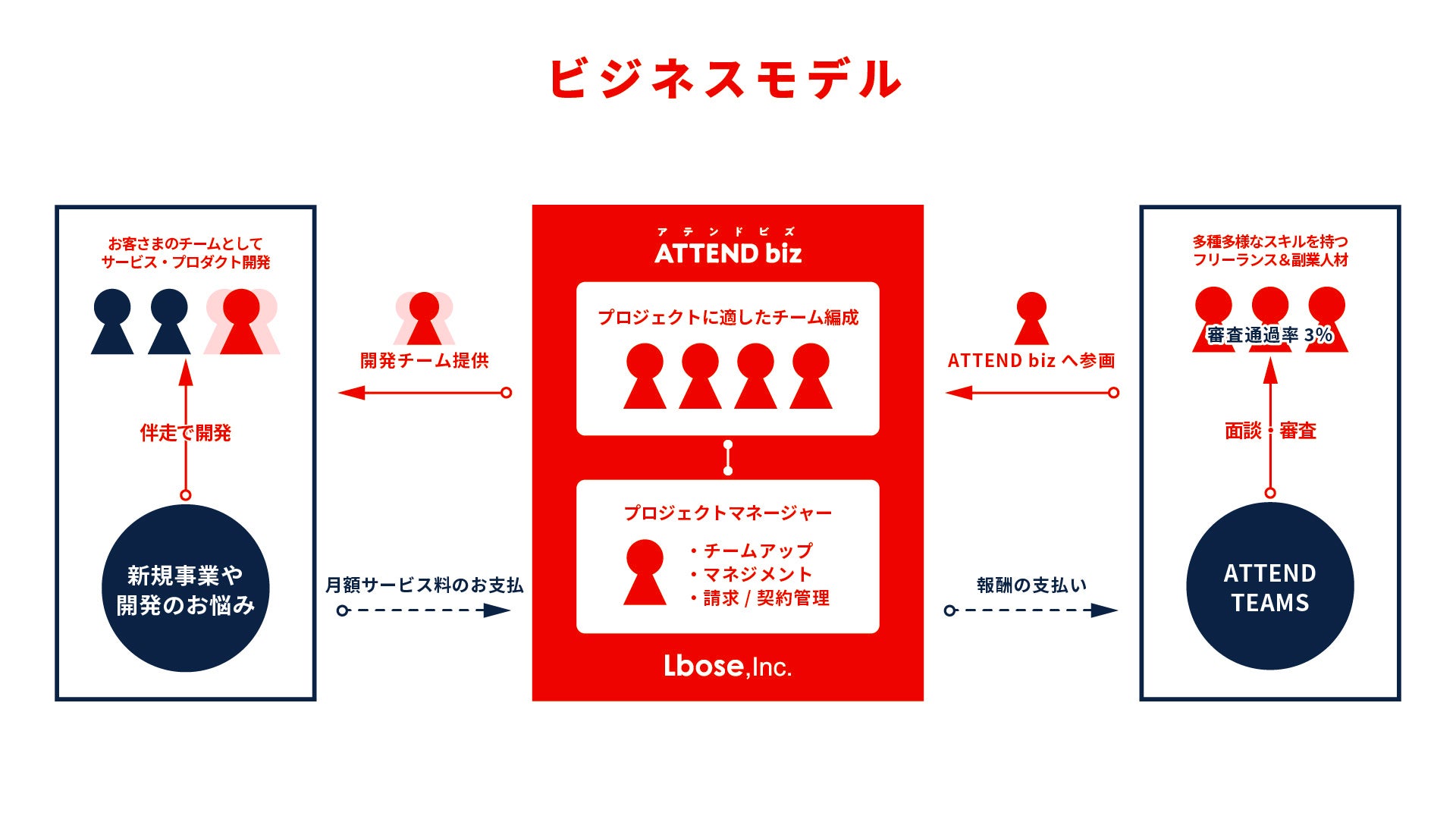 Lbose(エルボーズ)は、「"誰と、どこで、何をするか"を、もっと自由に。」をミッションに掲げ、働き方に関する課題解決を目指し、2017年に創業しました。多様な働き方や契約形態のメンバーが混ざり合うフレキシブルなチームの可能性を信じ、創業時からフルリモート×フルフレックスの働き方を導入。メンバーの90%以上がフリーランスとして働くチームの強みを活かし、新規事業立ち上げ支援「ATTEND biz」、月額制アジャイル開発支援「レンタル開発チーム」など、クライアントワークを中心とした事業を展開しています。