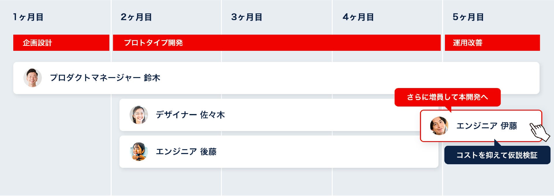 フェーズ毎に必要なタイミングでフリーランスメンバーの増減が可能です。