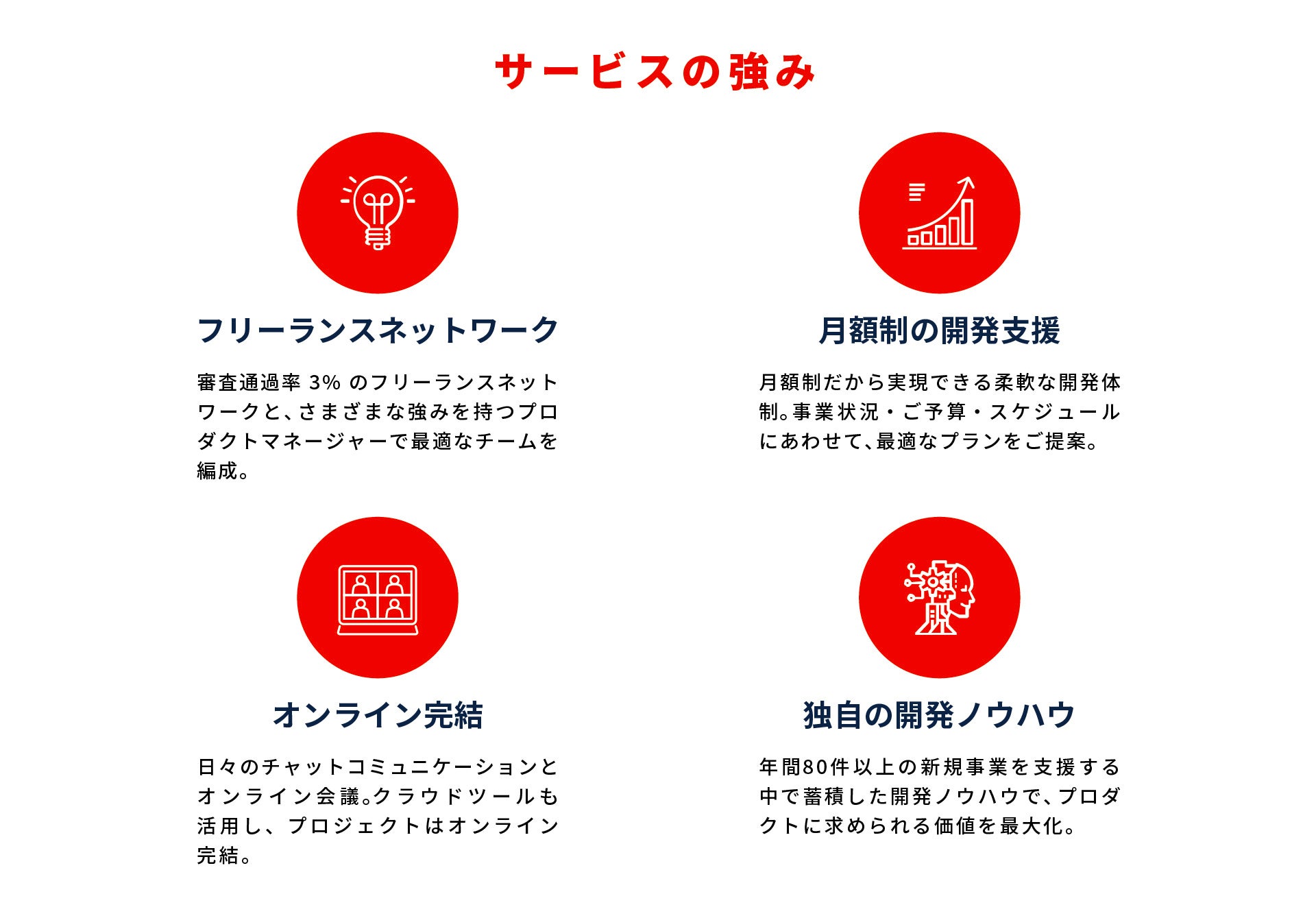 ATTEND bizは「新規事業に特化した伴走型開発チーム」をキャッチコピーに、「月額制」×「フリーランス」の柔軟な開発体制とプロダクトマネージャーを合わせて提供することで、企業の開発の支援を行ってきました。フリーランスは3,000名以上のフリーランス人材ネットワークから厳選し、通過率3%の審査を経てアサインを行っています。