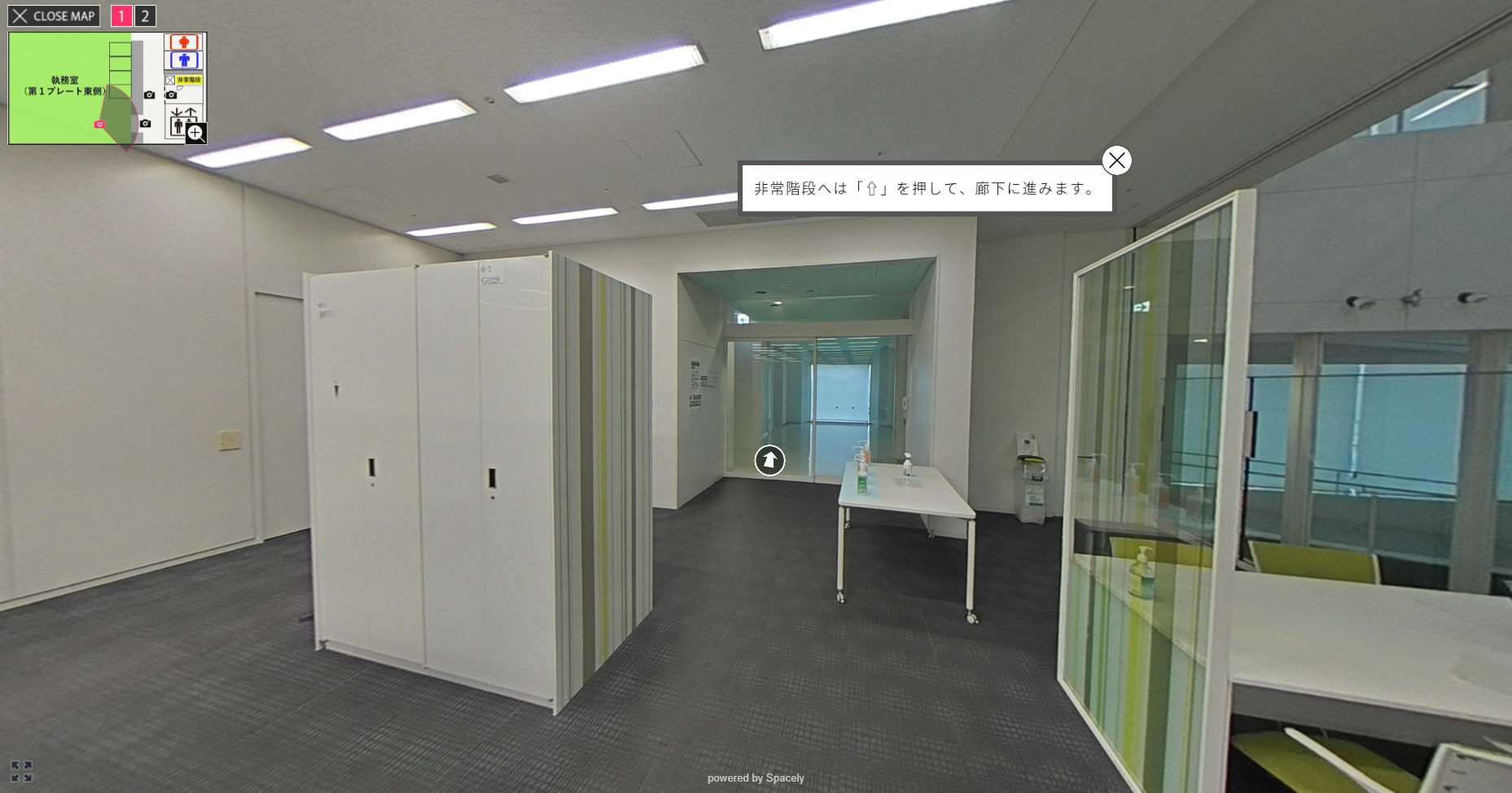 そこで今回、当社のVRクラウドソフトを活用してコンテンツを作成し、研修対象となる600名以上の従業員に配布し備蓄倉庫のVR研修は2021年9月、避難訓練のVR研修は2021年11月から実際に訓練を行いました。各従業員の社内PCからの閲覧が可能で、避難経路の確認や、備蓄倉庫で備蓄物資の配布作業をするといったアクションを自分で疑似体験し操作して行うことができる内容となっています。