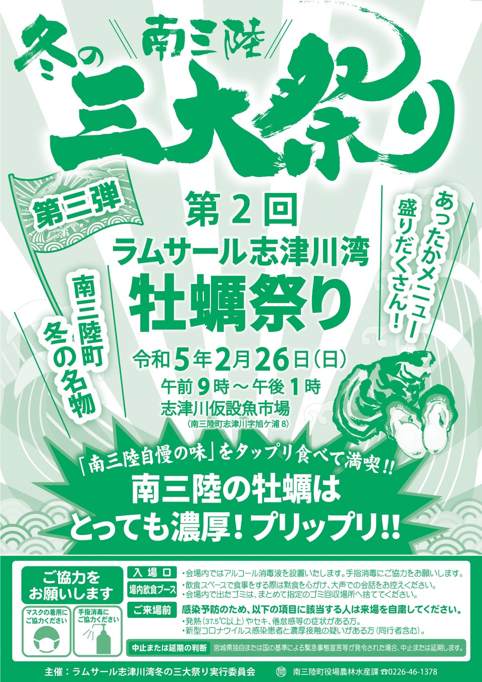 南三陸町では、仮設魚市場にて2023年2月26日(日)に「第2回ラムサール志津川湾牡蠣祭り」を開催いたします。また同日に南三陸ハマーレ歌津にて「春つげわかめまつり」を開催します。