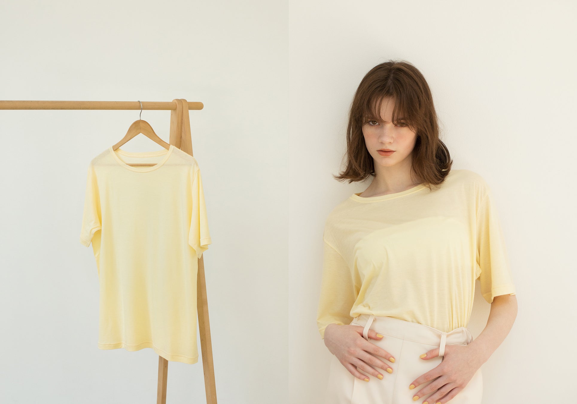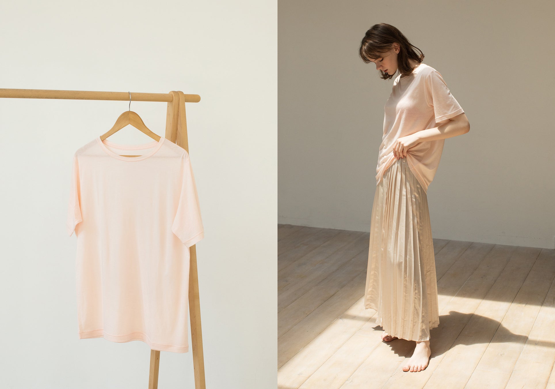 「canvas」のネイルポリッシュのニュアンスカラーに染め上げた、自分らしく想いのままに着こなせるシアーTシャツ。絶妙な透け感とアレンジ自在な丈感が特徴です。上品なニュアンスカラーをゆったりとしたシルエットに合わせることで、甘すぎない仕上がりに。