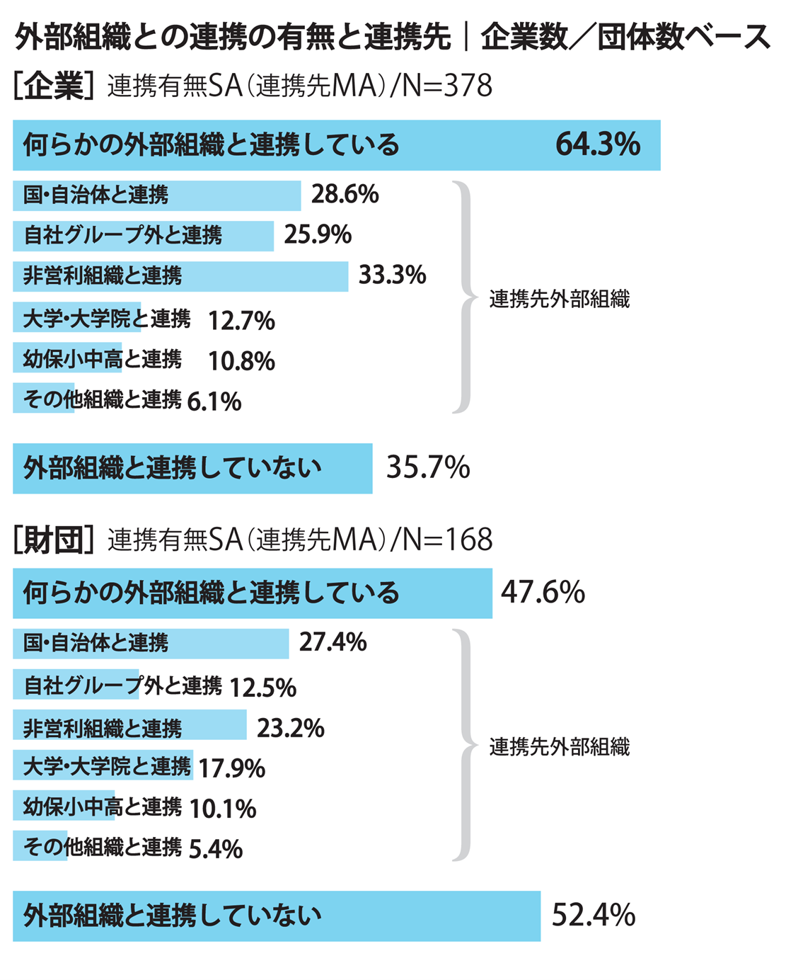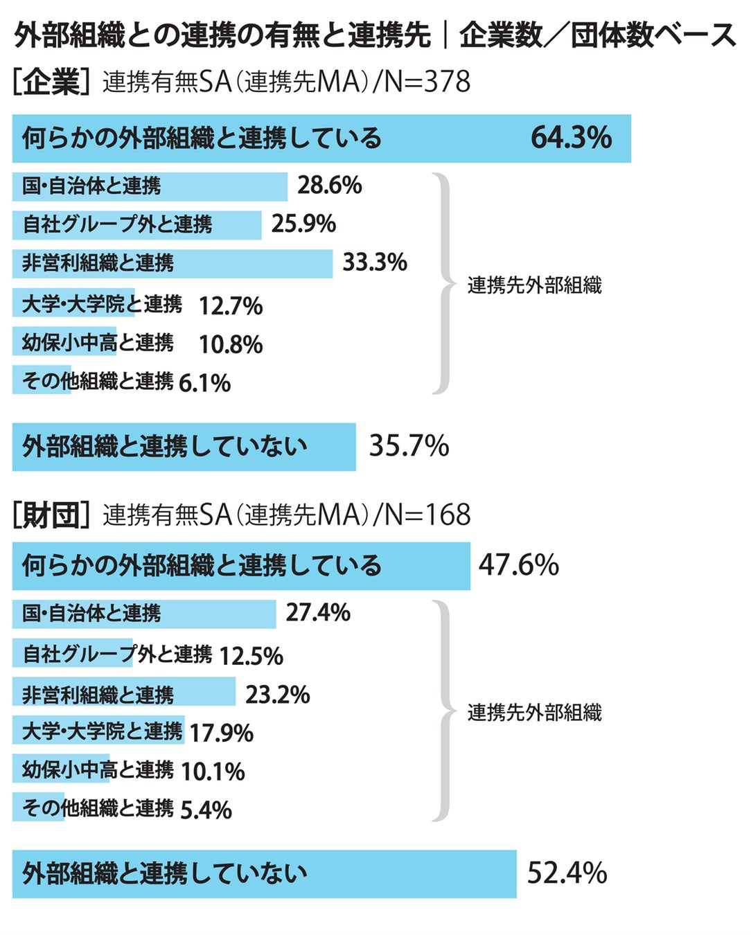 企業は約6割強、企業財団は5割弱が何らかの外部組織と連携していると回答。互いの知見やノウハウを活用することで活動の幅を広げている。
