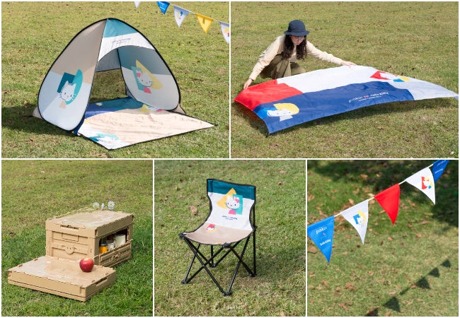 ワンタッチテントや折りたたみ式収納ボックスなど全5種類のラインナップ。ハローキティのデビュー当時のカラーをイメージした赤、青、黄色、そして大自然にもよく馴染むアースカラーを用いて、シンプルでスタイリッシュなデザインに仕上げました。リラックス感漂う、大人のアウトドアにぴったりです。