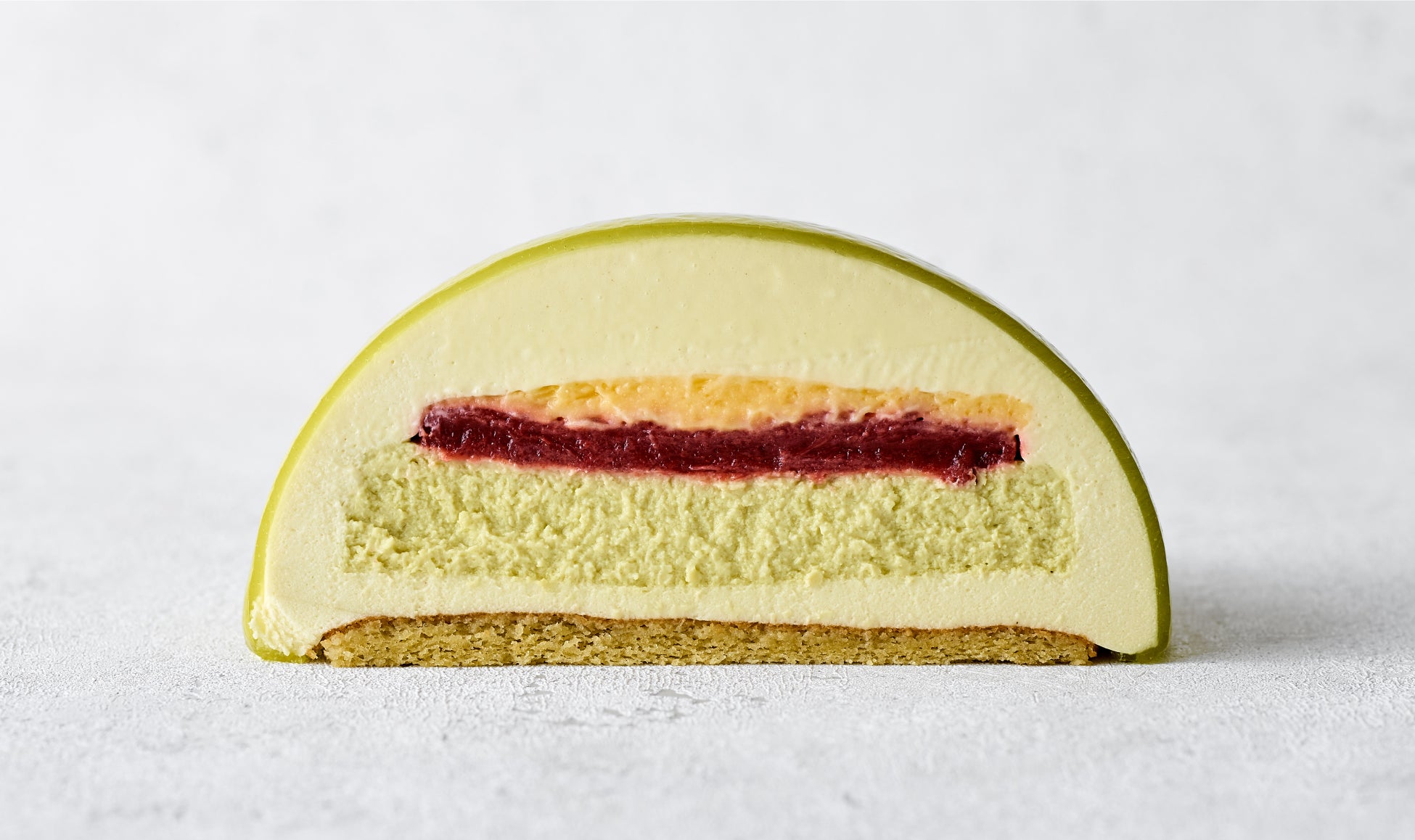 表面はピスタチオゼリーでおおわれており、ピスタチオムースとレモンクリームの酸味とイチゴとルバーブのジャムがアクセントになっております。この冬限定のベイユヴェールオリジナルクリスマスケーキ。