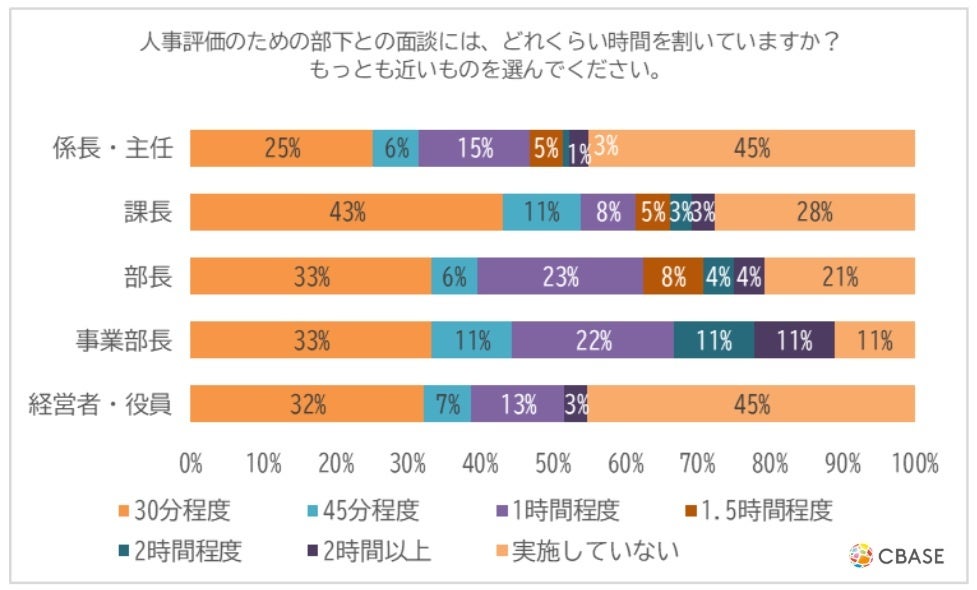 役職別に見てみると、面談の実施率が高く、「2時間以上」と回答した割合ももっとも高いのが「事業部長」となりました。役職別に違いがありますが、面談を実施していない割合がもっとも高いのは「経営者・役員」という結果となりました。