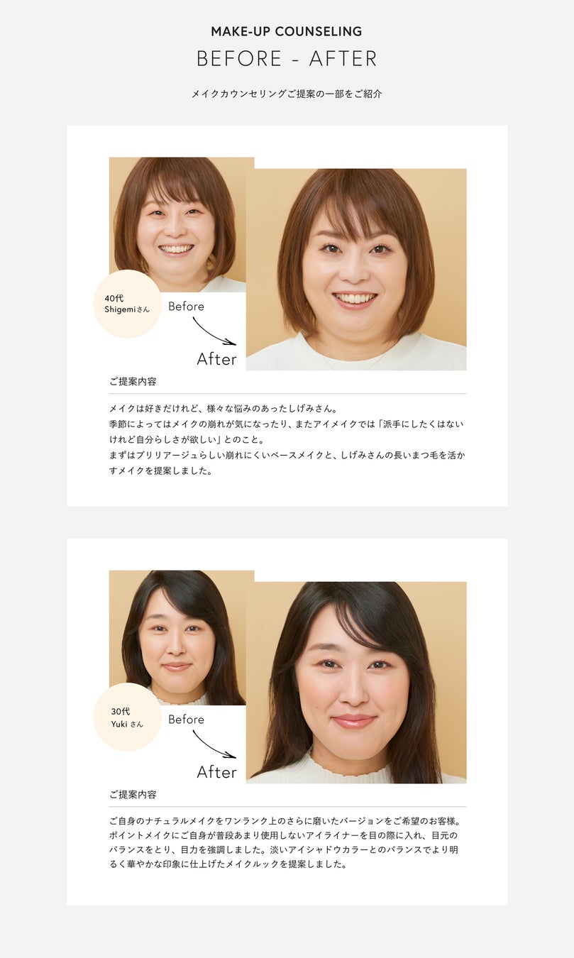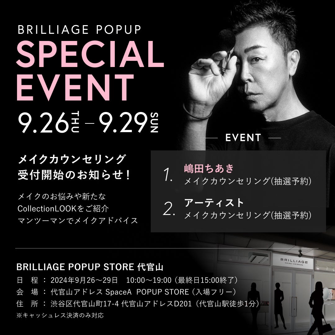 POPUP STOREでは嶋田ちあき、ブリリアージュアーティストによるメイクカウンセリングも実施いたします!メイクのお悩み解決⽅法、新たなメイクLOOK などをお伝えいたします。