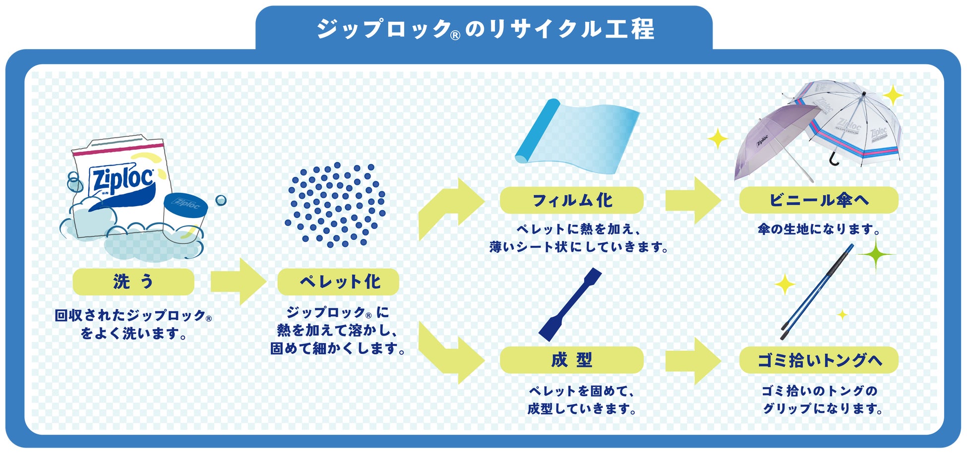 活動のひとつとして、使用済みのジップロックⓇを回収※し、別のプラスチック製品に作り替えることで廃プラスチック問題の解決に貢献する『Ziploc RECYCLE PROGRAM』を実施しています。捨てられてしまうことが多いビニール傘の廃棄問題に着目し、ジップロック®のバッグをリサイクルした素材を傘布に使用した傘をシェアリングサービスに活用する活動や、傘の手作りキットを製作しています。このキットを使って、世界に一つだけのサステナブルなオリジナル傘を作れるワークショップを自治体や教育機関などを中心に開催しております。また、海洋ごみ問題に対する清掃活動の支援として、ジップロック®スクリューロック®をリサイクルしたごみ拾いトングの製作および活動団体への貸与も行っています。