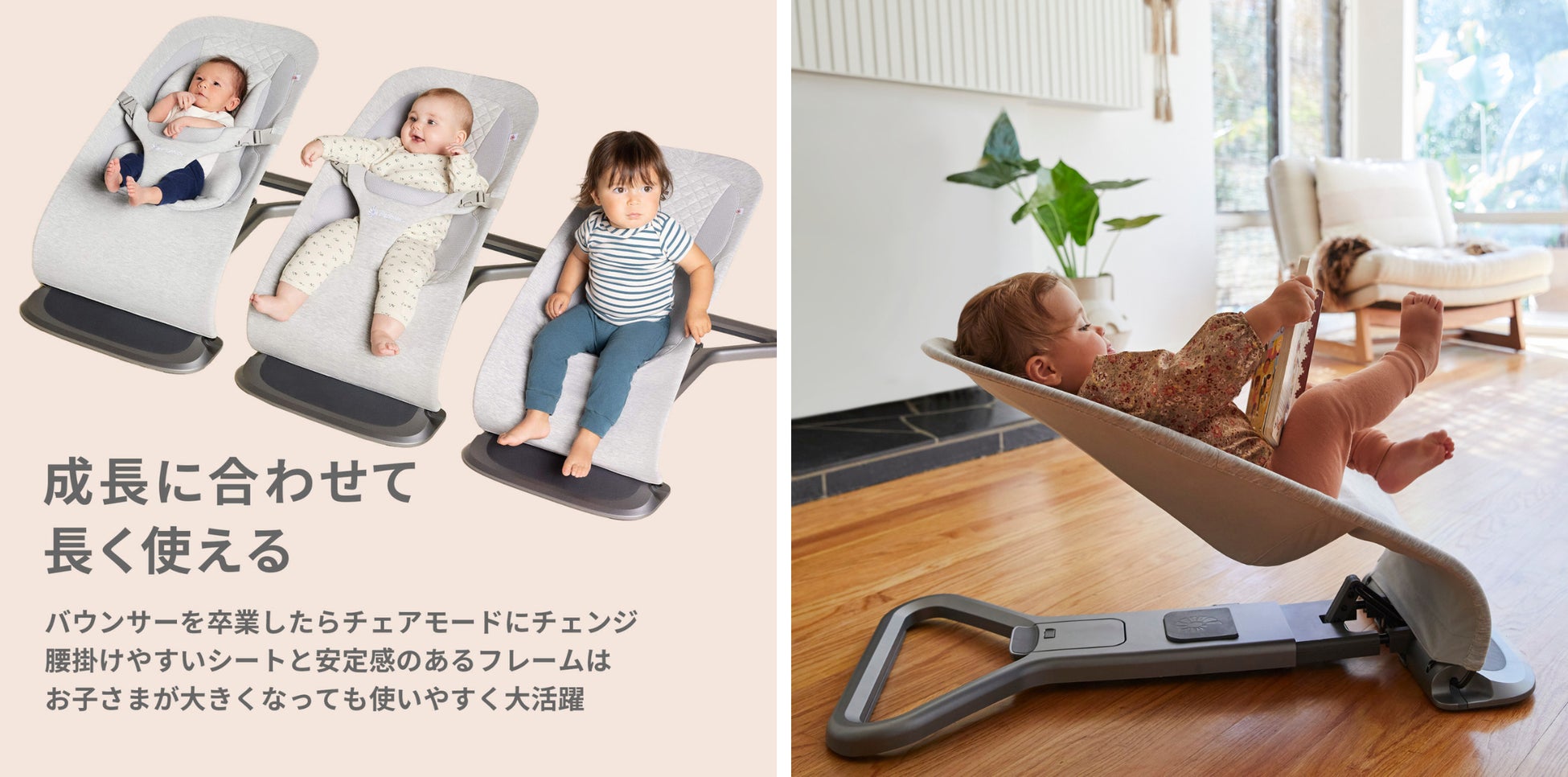 専用のインサートが付属していることで、まだ体がやわらかい首すわり前の赤ちゃんが使用可能。バウンサーの使用が終わった後はチェアとしても使えるため、活躍する期間が長いことも特徴。お子さまの成長と共に、evolve―進化するバウンサーです。抱っこのような安心感で赤ちゃんを包みこみ、パパママに少しのゆとりの時間をもたらします。育児の負担を減らし、家事の効率化を推進するアイテムとして出産準備品におすすめです。