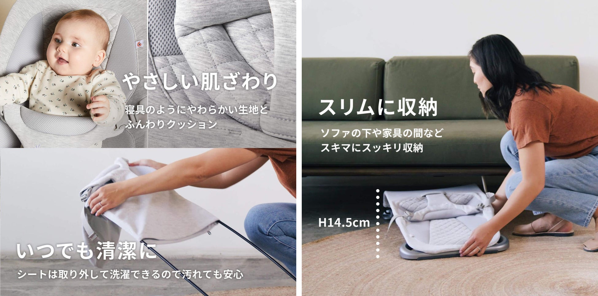 おうちの中で赤ちゃんと過ごす時間はかけがえのない時間ですが、ずっとそばに寄り添い、抱っこし続けることは難しいものです。食事や家事、上の子のお世話など、赤ちゃんの抱っこが難しいシーンでも安心して任せられるように、赤ちゃんがごきげんに過ごせるための快適性を追求しました。