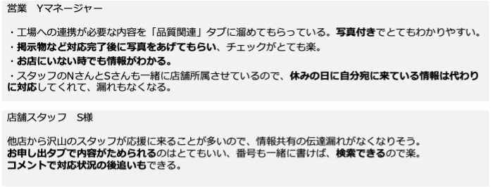 現在「はたLuck」は、店舗と担当営業や営業本部間での情報共有ツールに加えて、工場と店舗をつなぐ情報共有ツールとして運用が始まりました。従業員からは「写真で共有できたり、チャットでやり取りできるようになり、とても便利になった」と声が上がっています。今後は中京エリアの店舗と工場へ展開し、ゆくゆくはFAX運用を減らして、社員・スタッフ誰でも「はたLuck」を見ればお店の状況を把握出来る環境を目指してまいります。
