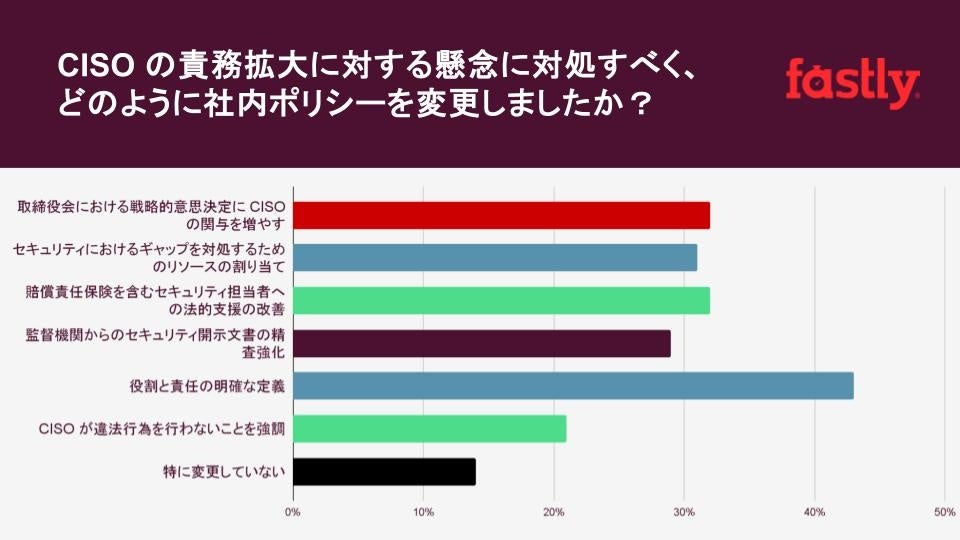 グローバルでエッジクラウドプラットフォームをリードする Fastly, Inc. (NYSE : FSLY) の日本法人であるファストリー株式会社 (カントリー・マネージャー 今野 芳弘) は本日、企業の最高情報セキュリティ責任者 (CISO) の説明責任に関する調査結果を発表しました。調査によると、日本企業の 86% (世界: 93%) が、CISO 個人の責務拡大に対する懸念に対処するため、過去 1 年間にポリシーを変更したことが明らかになりました。調査対象となった日本企業の 3 社中 1 社 (32%) が取締役会における戦略的意思決定に CISO の関与を増やしていることもわかりました。