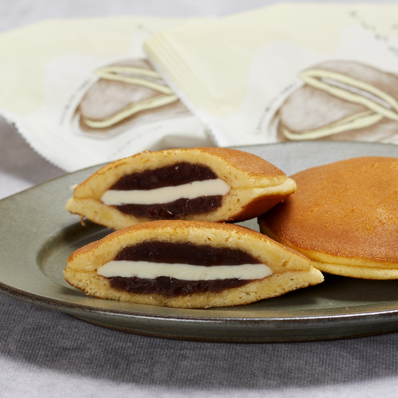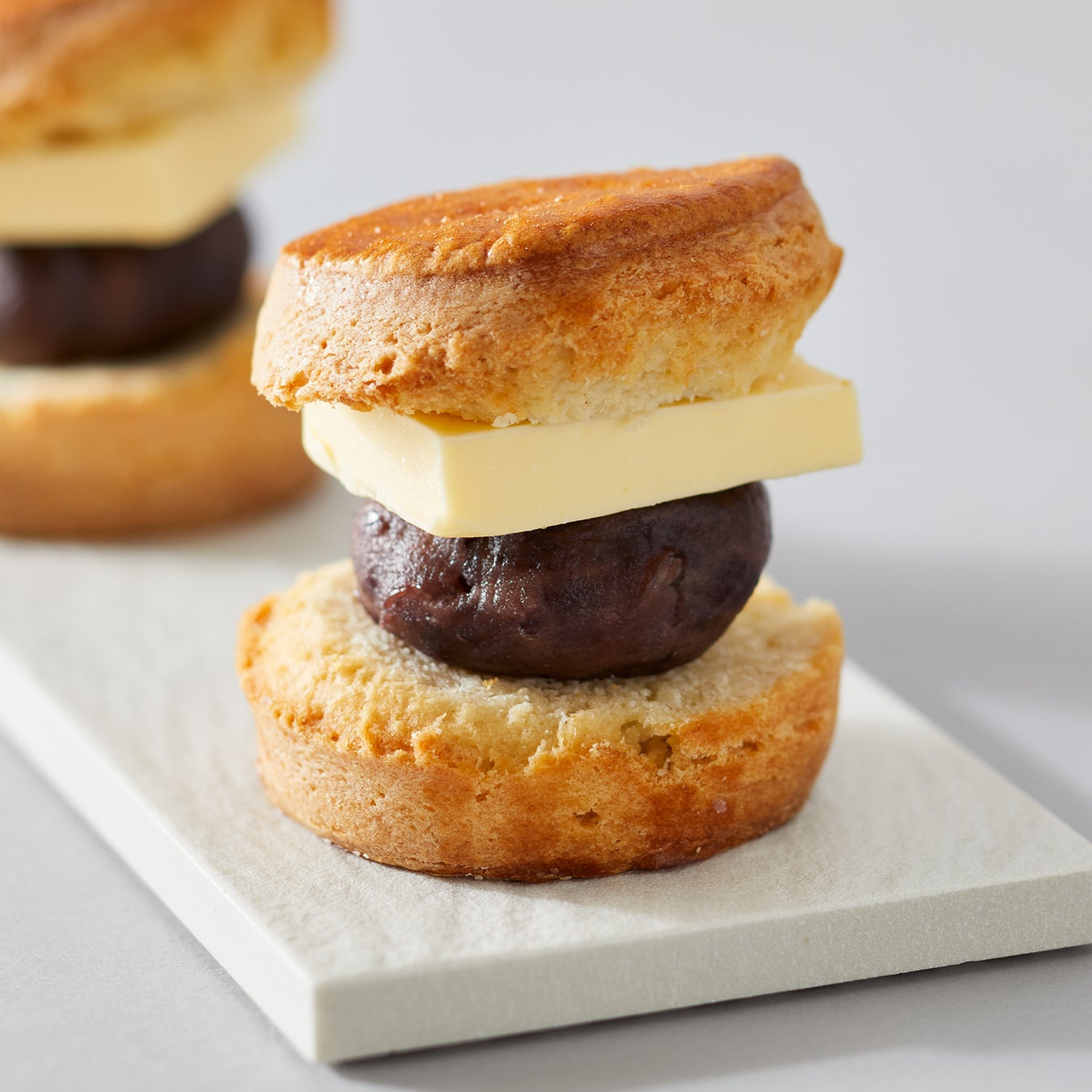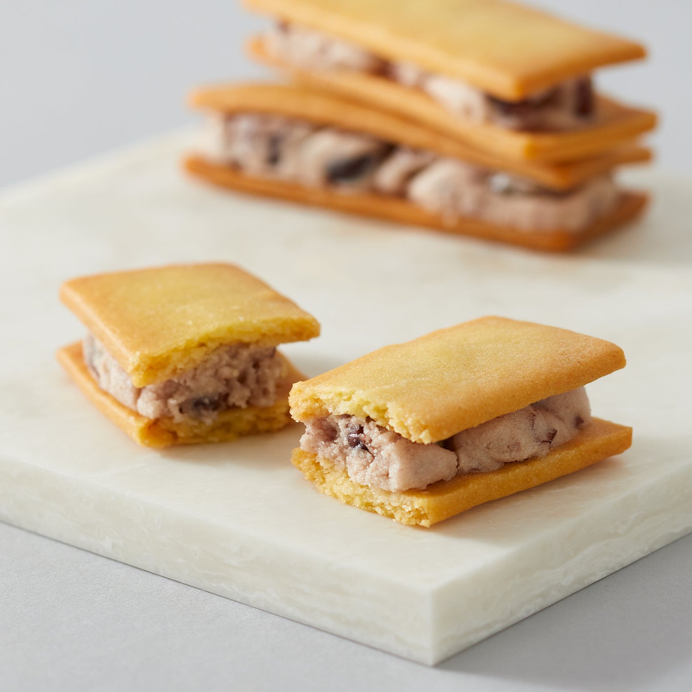フランス産小麦を使用したビスキュイで、発酵バターとホワイトチョコレート、自家製の粒あんを合わせたクリームをサンドしました。