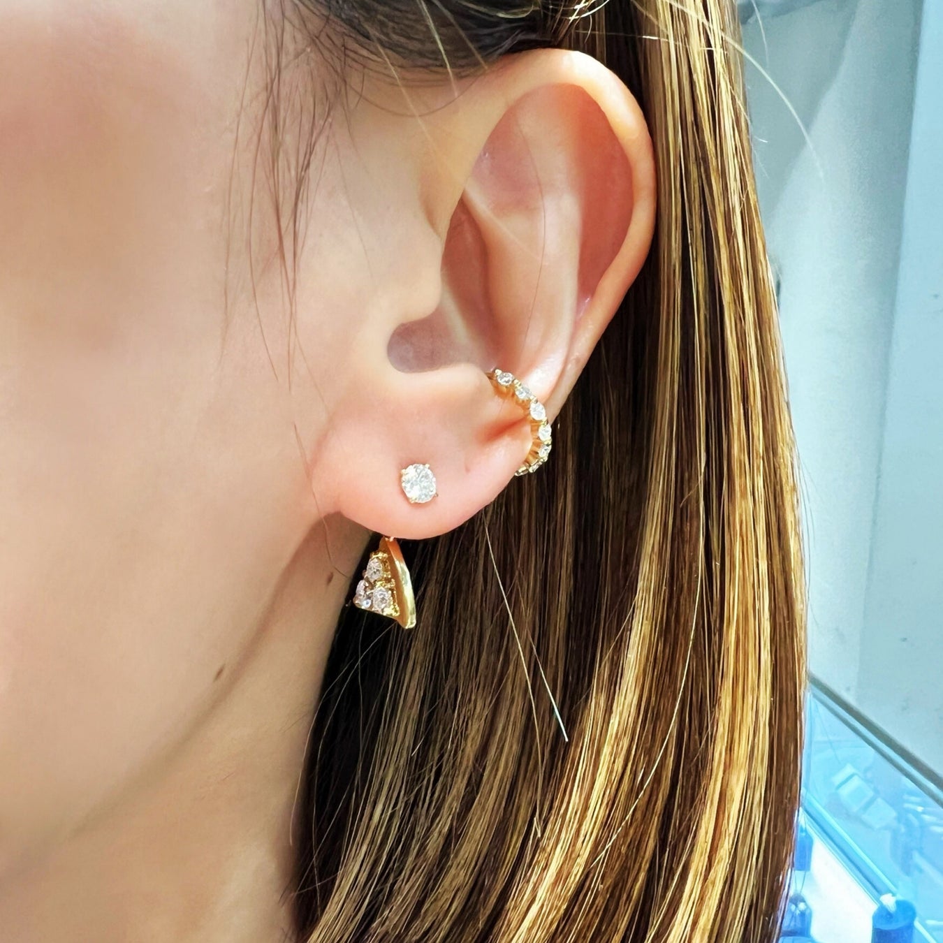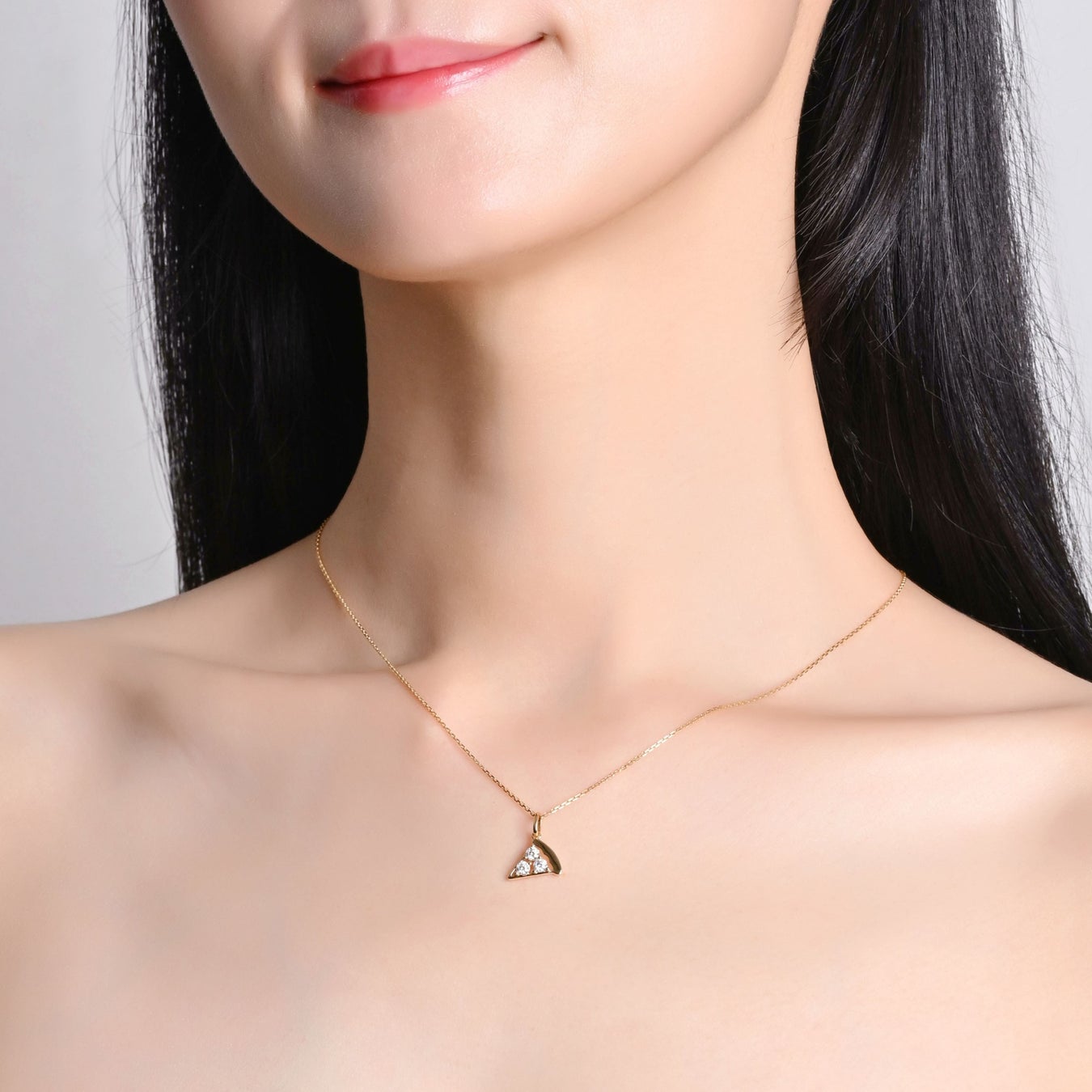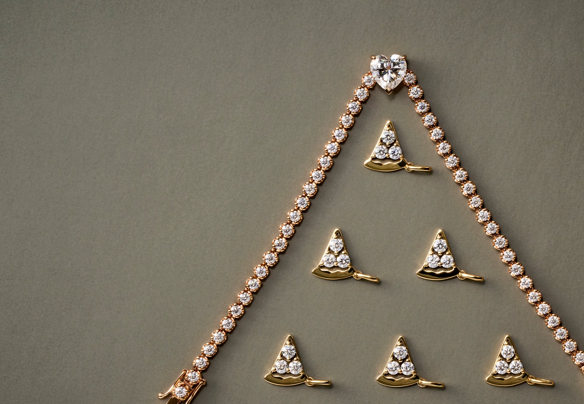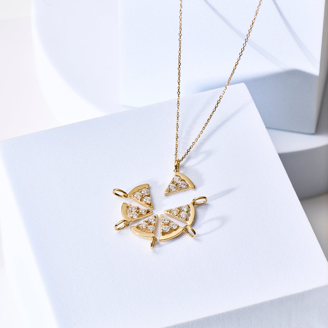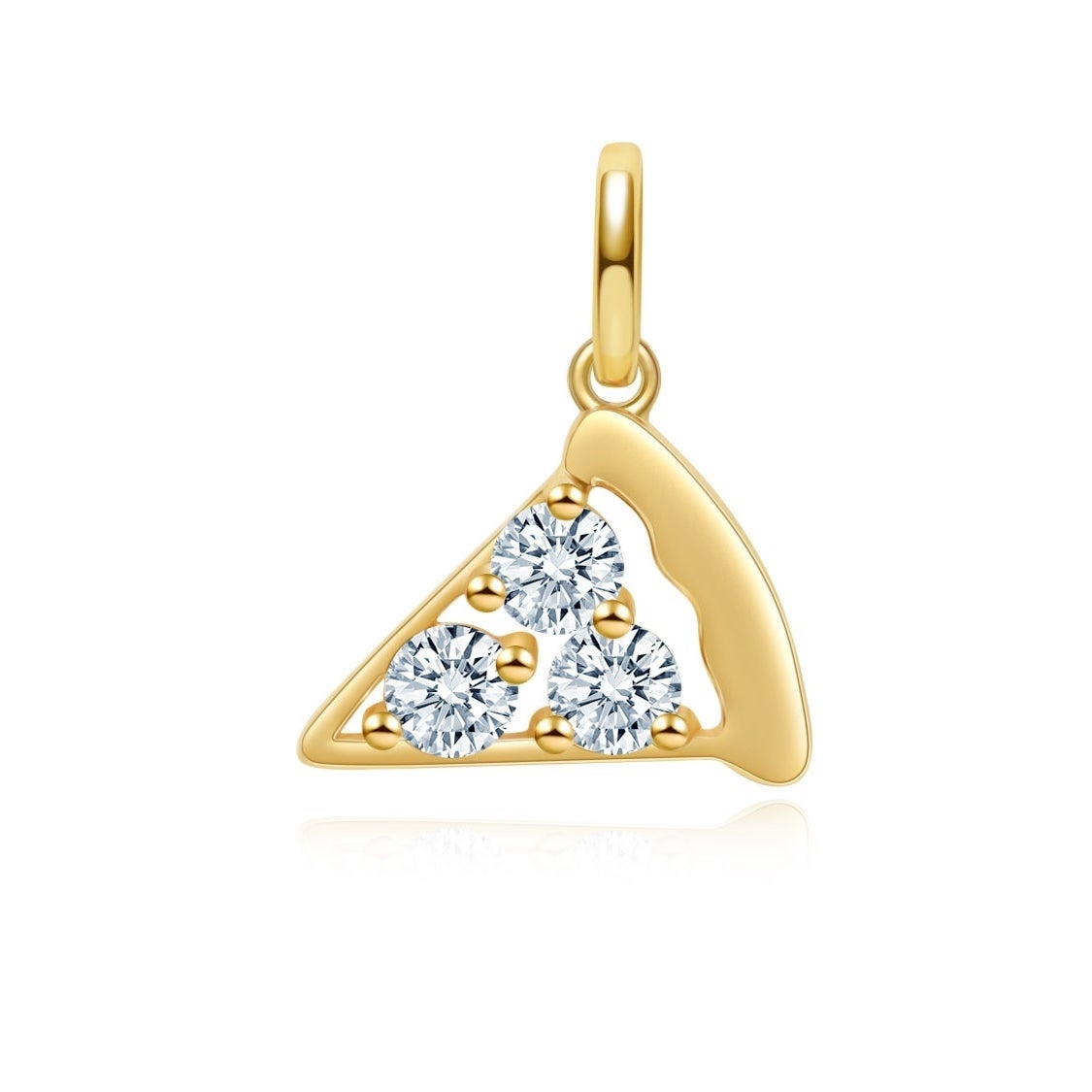 ピザをシェアする喜びに、愛や幸せをシェアするイメージを重ねてデザインしたShare Love Pizza チャームは、計0.3ctのモアサナイト3粒とK18イエローゴールドで仕立てました。お手持ちのネックレスやチェーン、ピアスと組み合わせて自由にお楽しみいただけます。価格は55,000円(税込)。