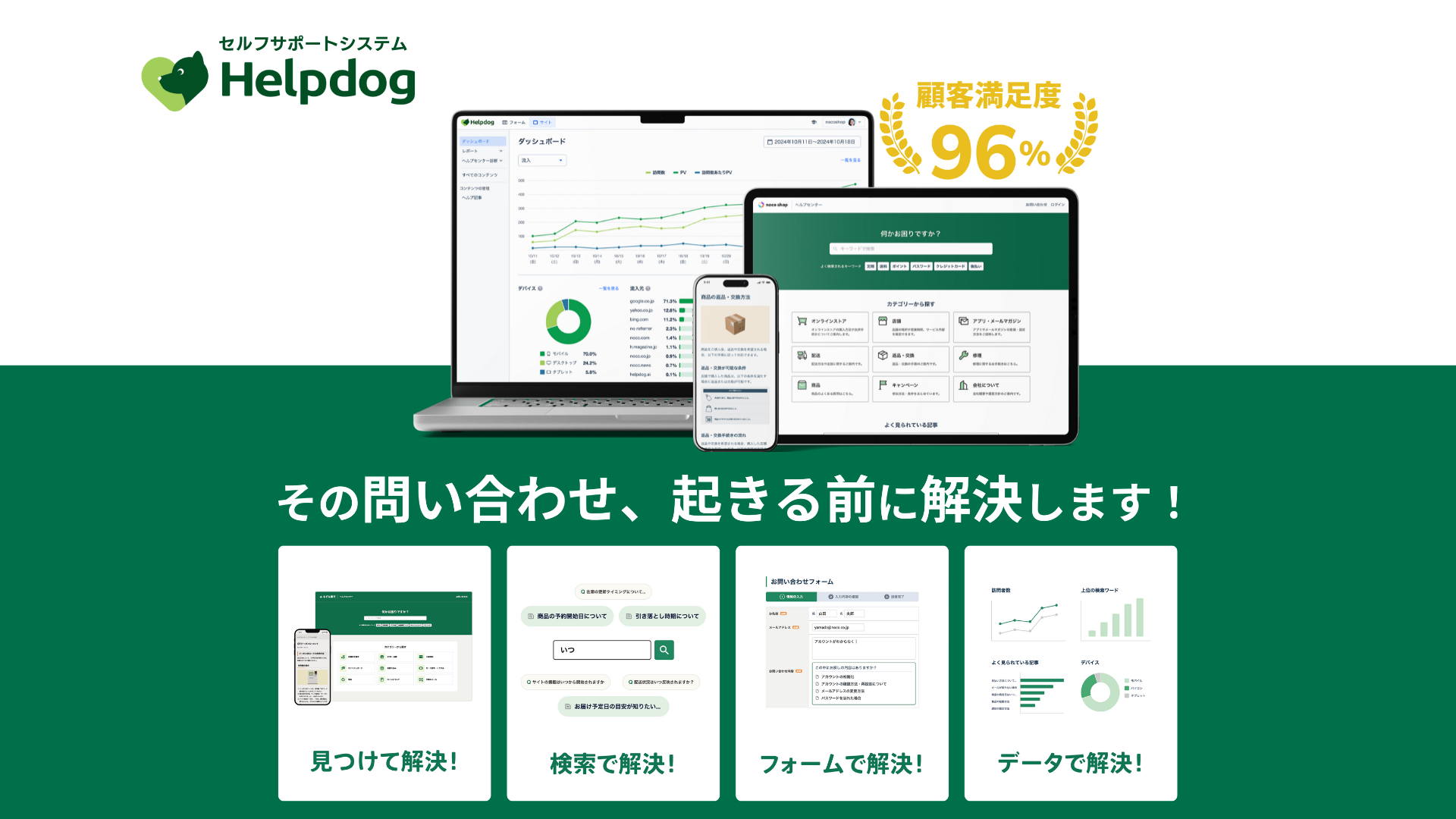 「ヘルプドッグ」は、FAQサイト・AIチャットボット・フォームを一体化したセルフサポートシステムです。利用者が知りたい情報にすぐたどり着けるよう、直感的な検索体験とわかりやすいUIを提供し、問い合わせの削減と顧客満足度の向上を実現します。さらに、担当者が専門知識なしでも継続的に運用・改善できる仕組みを備え、企業のサポート業務を効率化します。公式サイト:https://helpdog.ai/