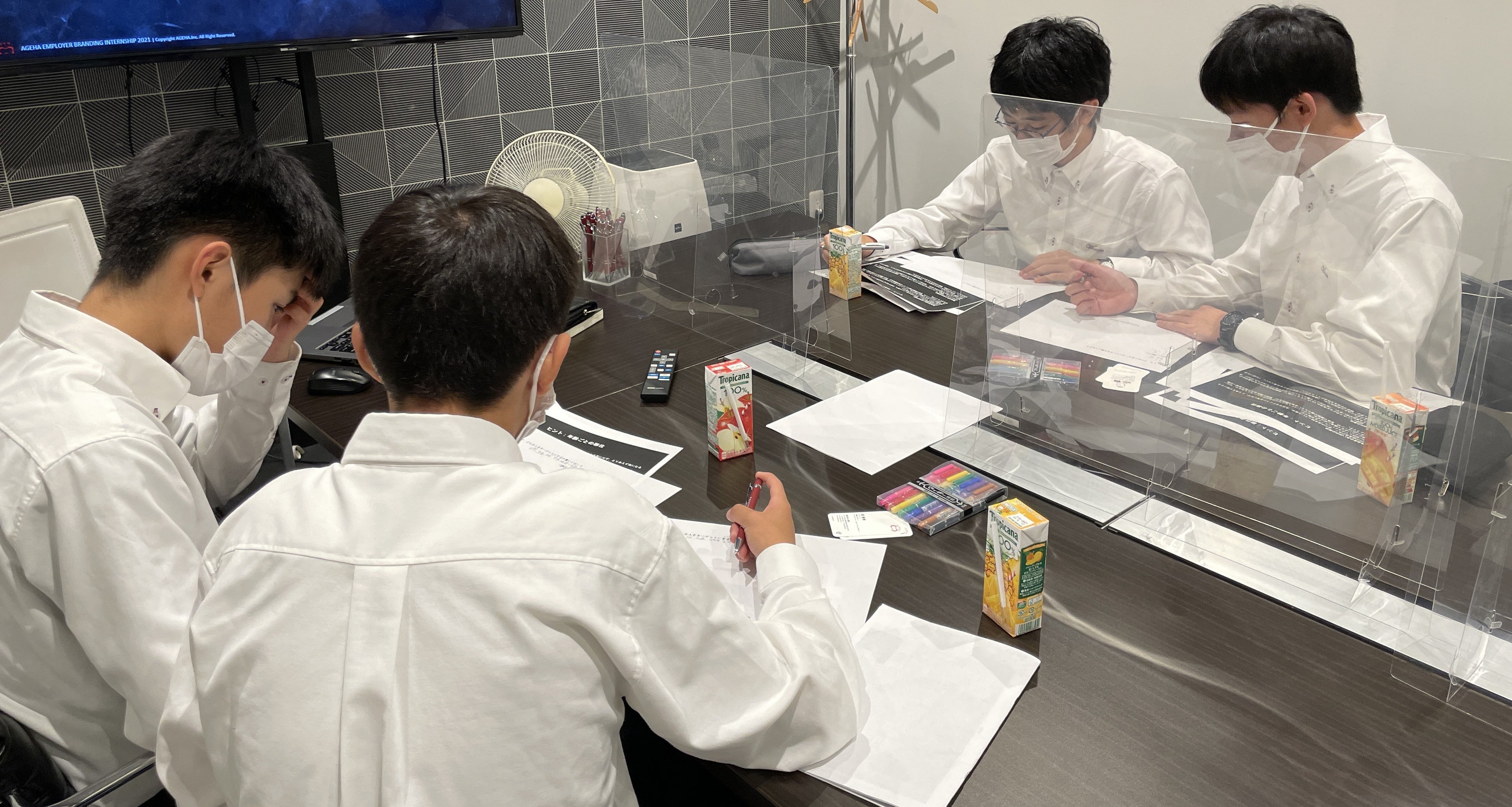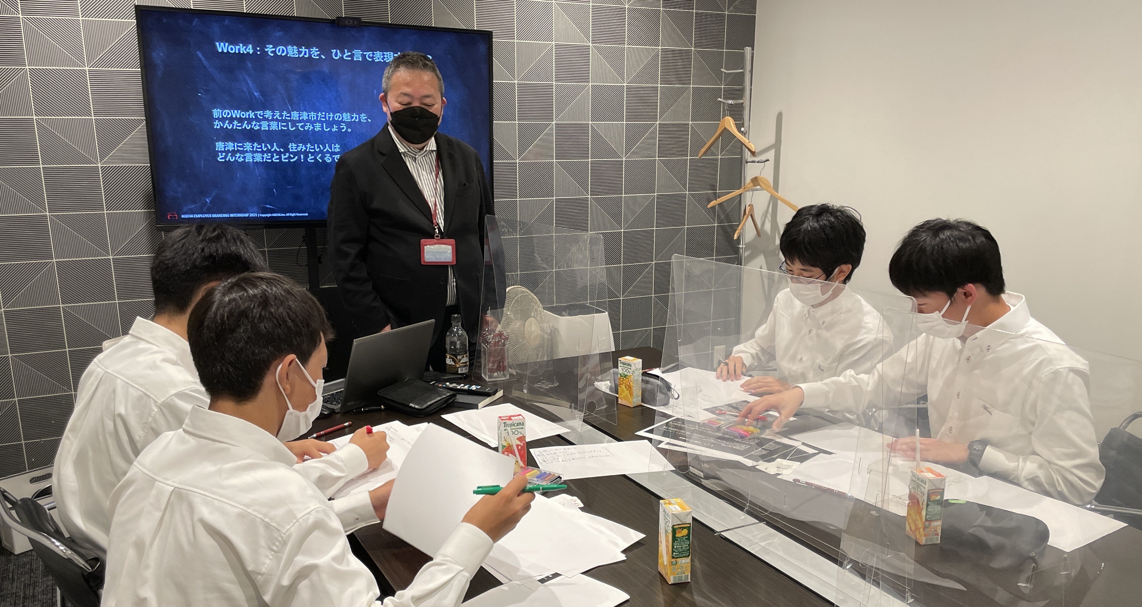 佐賀県唐津市の早稲田佐賀高等学校では、高校1年生が将来を考える機会として修学旅行「東京研修」を実施しています。2022年11月8日、同行の生徒が東京都内の企業を訪問し、職業体験を実施。揚羽では4名の生徒を受け入れ、ブランディングの難しさ・楽しさを体感する「唐津市ブランディングワーク」を実施しました。