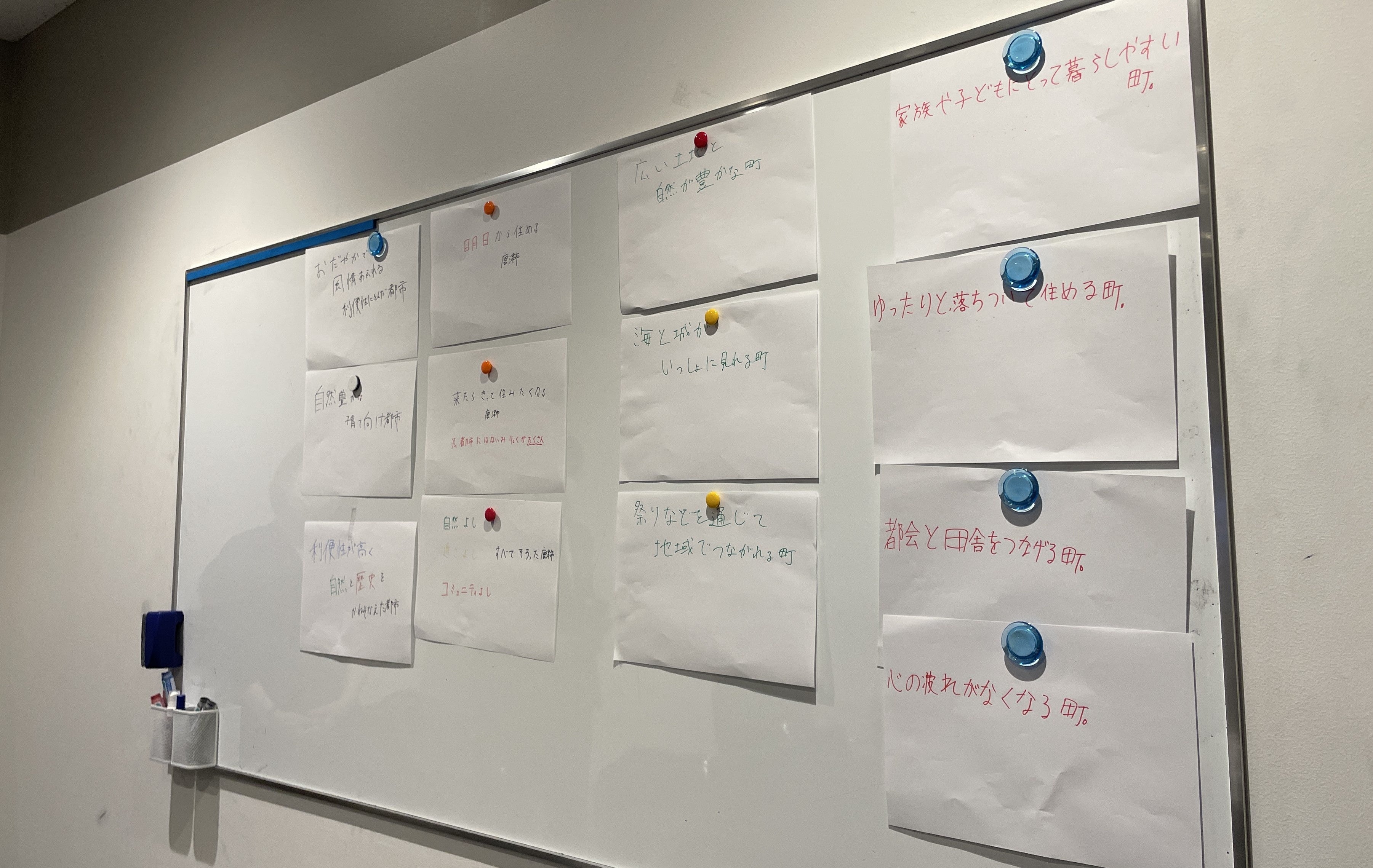 「唐津市へ移住する人を増やしたい」という設定に対し、移住し得るターゲット、唐津市の競合となる都市、唐津市特有の魅力を考え、唐津市のコンセプトを決定。生徒からは、唐津市の魅力として「自然」「都心(博多)までの近さ」「地域コミュニティ」「暮らしやすさ」があげられました。